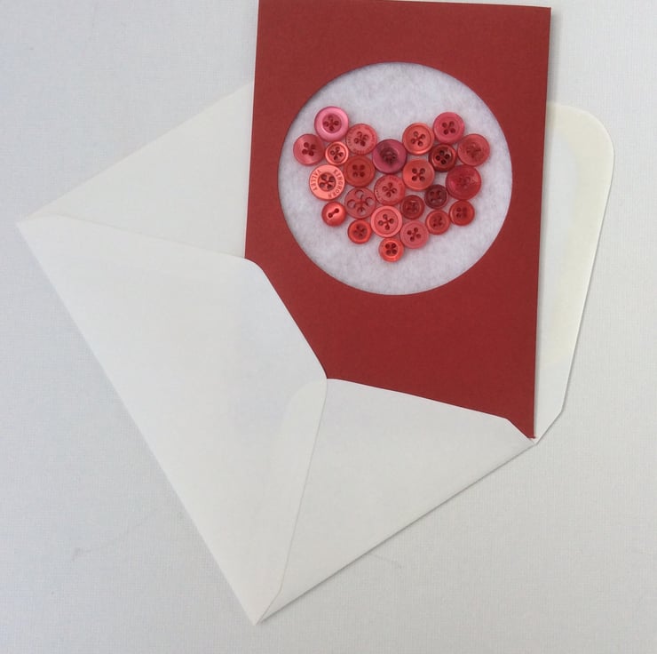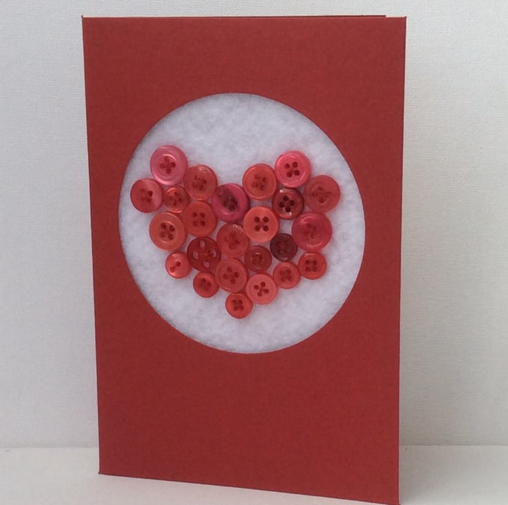 Beautiful, unique card, twenty four small red buttons in a heart shape, hand sewn onto white felt and set into a red card with a circular window. The card measures approximately 10.5 x 15cm and is blank inside for your own message.