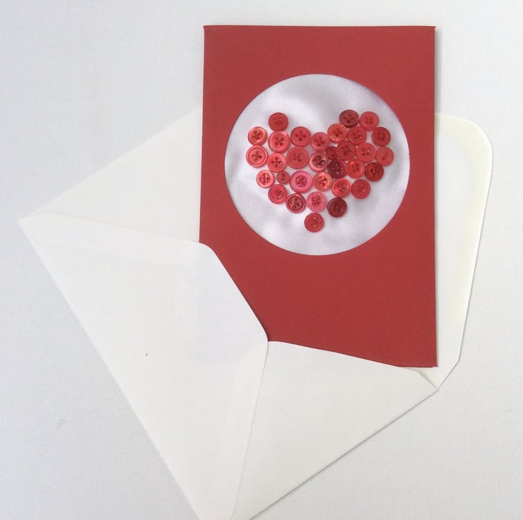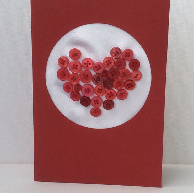 Beautiful, unique card, thirty two small red buttons in a heart shape, hand sewn onto white satin and set into a red card with a circular window. The card measures approximately 10.5 x 15cm and is blank inside for your own message.