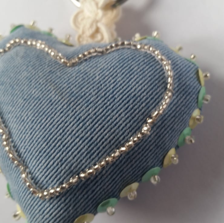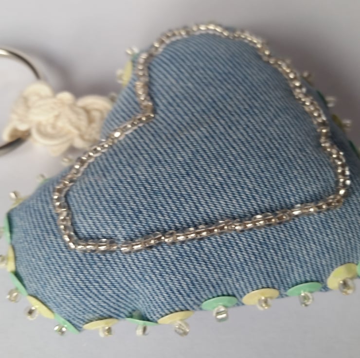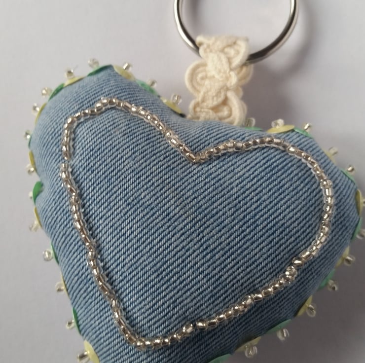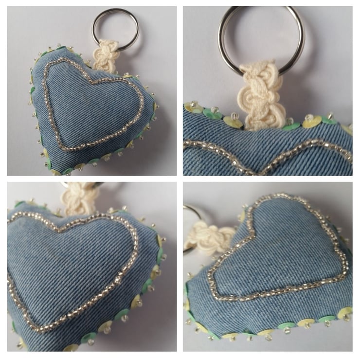 The fabric is denim and I have used cream weaved ribbon to attach the keyring.