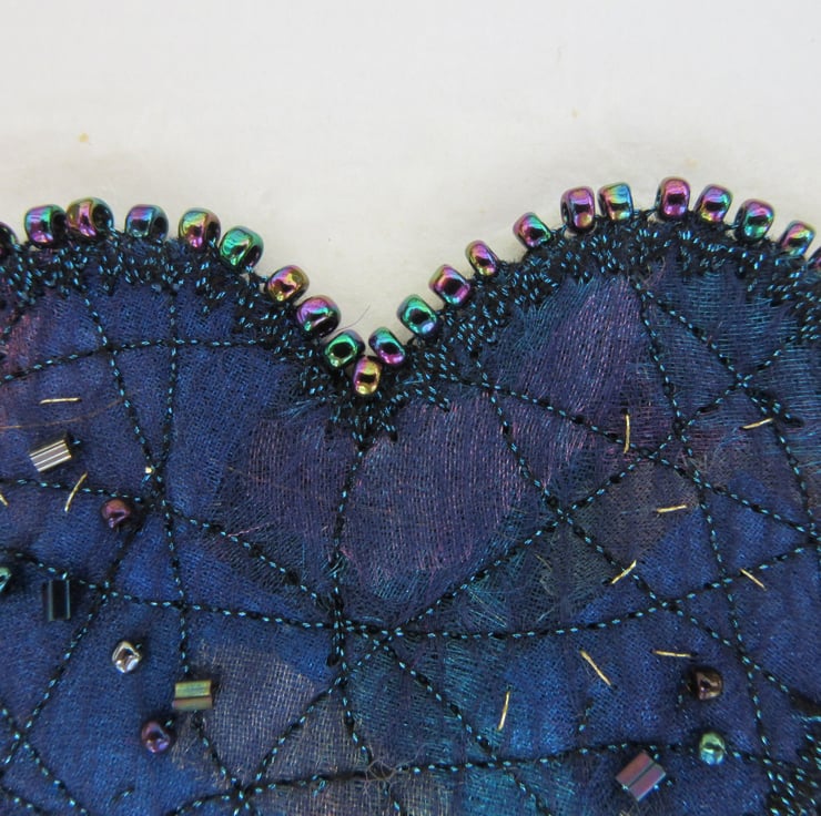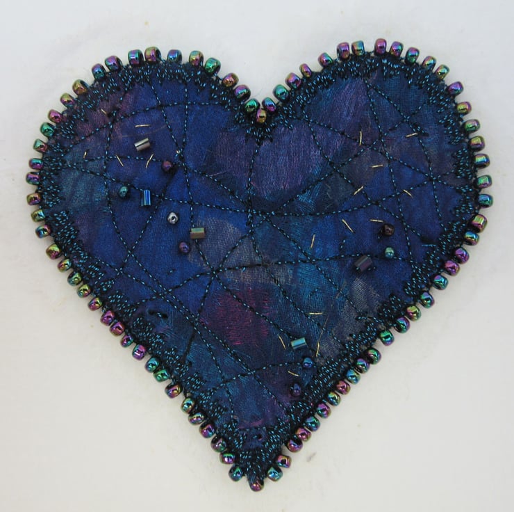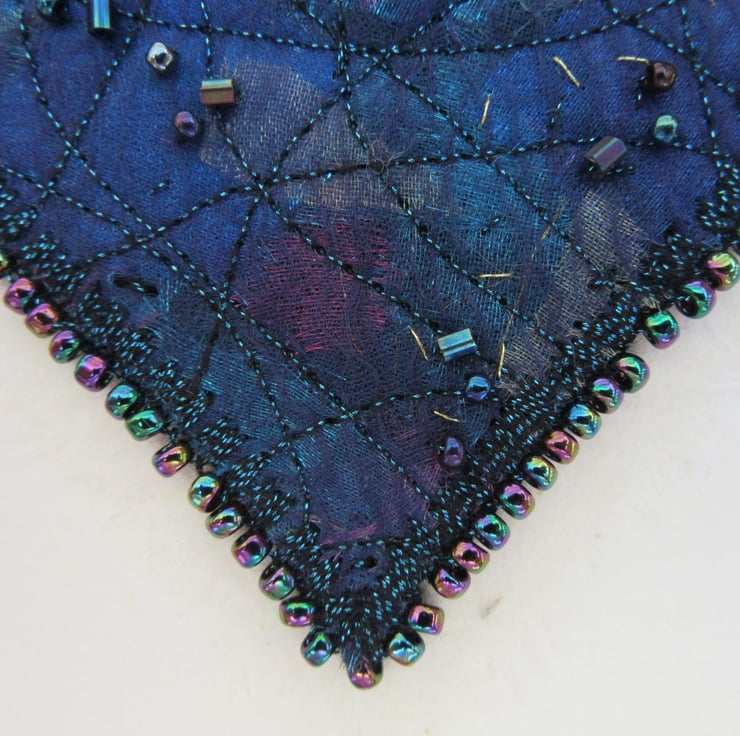 Made by layering organza fabrics and adding some free machine stitching and a sprinkling of beads and hand stitches. The heart edge has been decorated using tiny multi-coloured dark beads.
