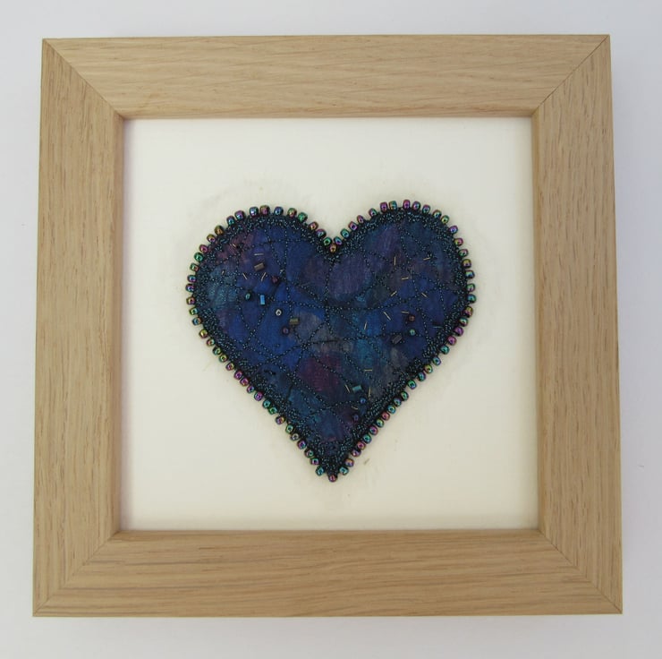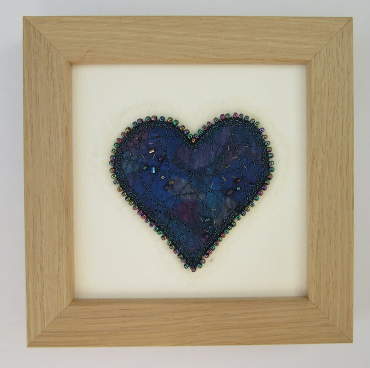 The fabric heart is mounted onto a fine hand made paper and cream mount board and then into a light oak wood frame.