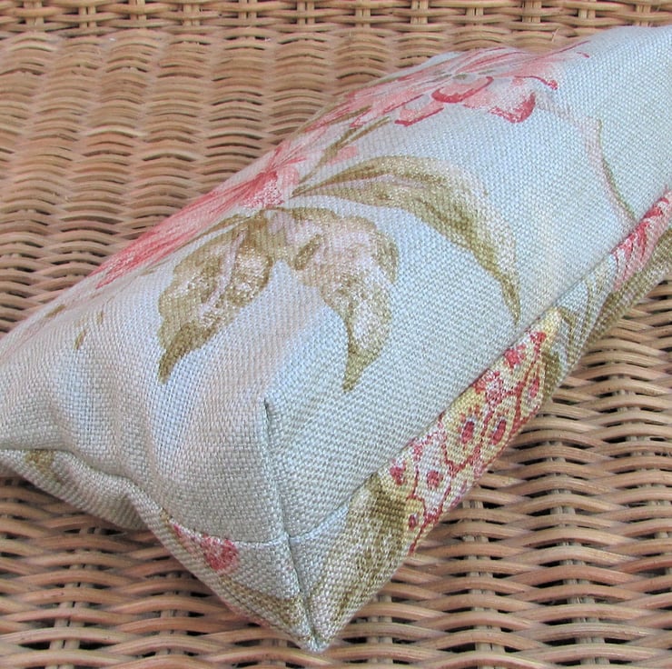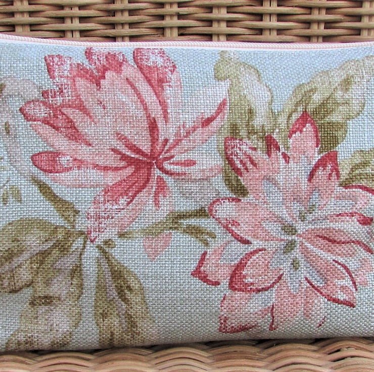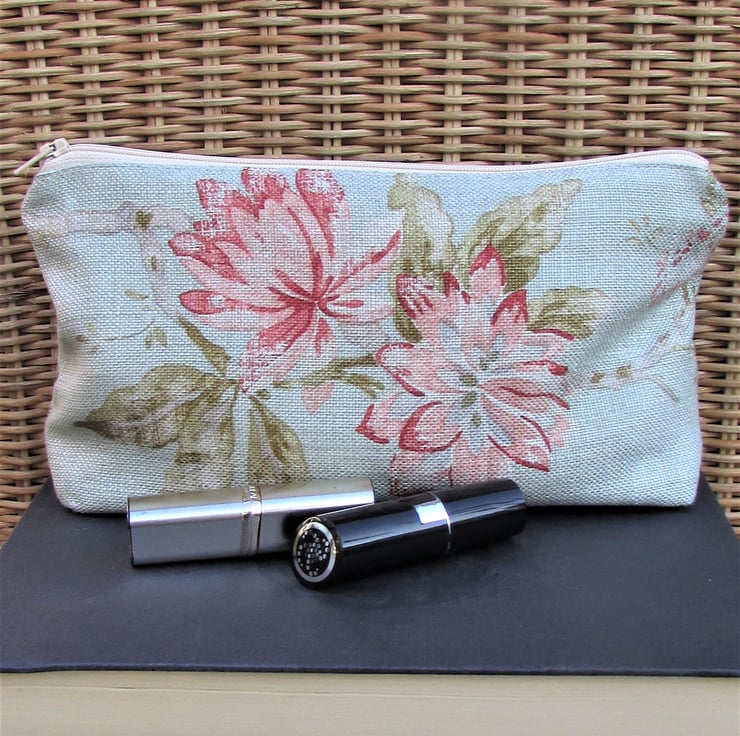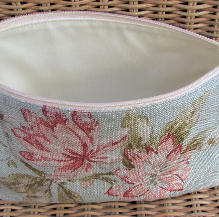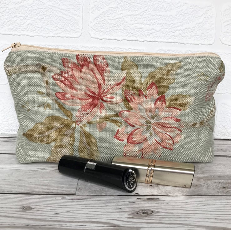 A pretty cosmetic bag in a loosely woven pale green fabric with a pretty pattern featuring large flowers in shades of pink with sage green leaves.The make up bag fastens with a cream zip and is lined with cream fabric. The base of the bag is boxed giving lots of space inside.
