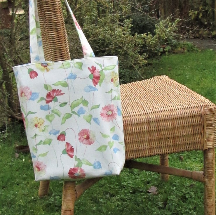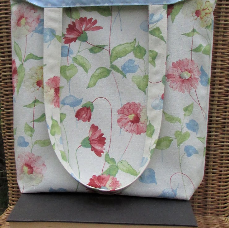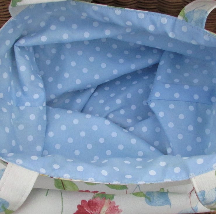 A handy tote bag in cream fabric with a floral print pattern in pretty pastel shades of pink, green, blue and yellow. The bag is lined with pale blue fabric with a white polka dot print pattern. The lining co-ordinates beautifully with the outer fabric.