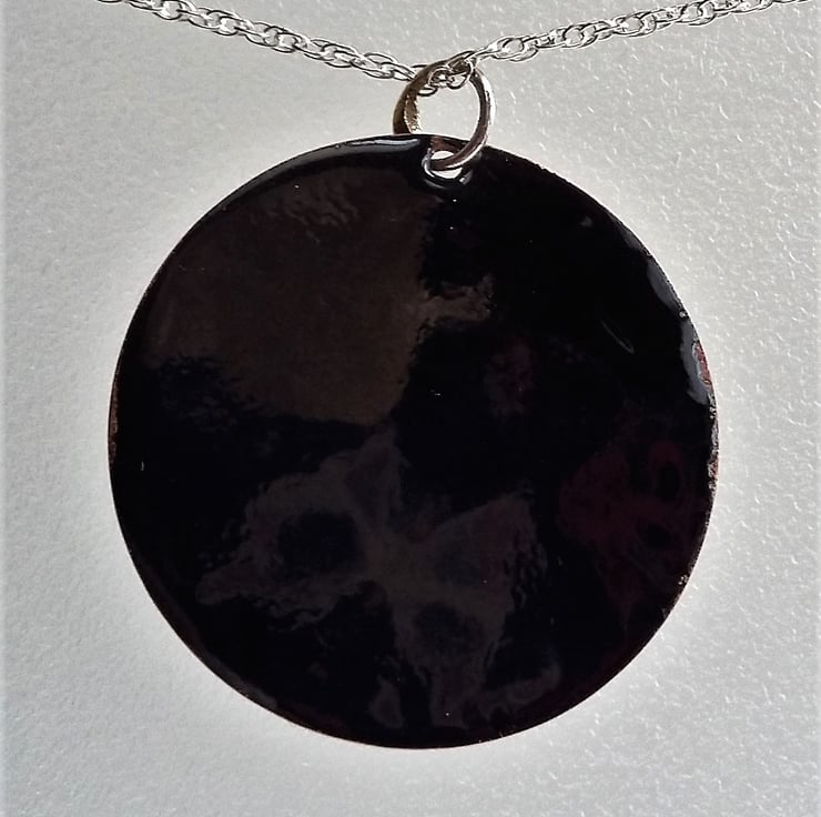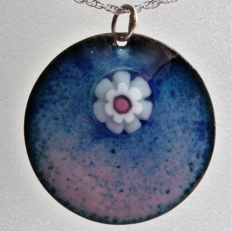 Round enamelled copper pendant in pinks and blues, with a millefiori insert. The pendant has been kiln-fired and measures approximately 30mm in diameter. The back has been finished in glossy black enamel. It comes complete with an 18” sterling silver rope chain with a soldered sterling silver jump ring and is supplied with a little organza pouch. POSTAGE IS FREE!
