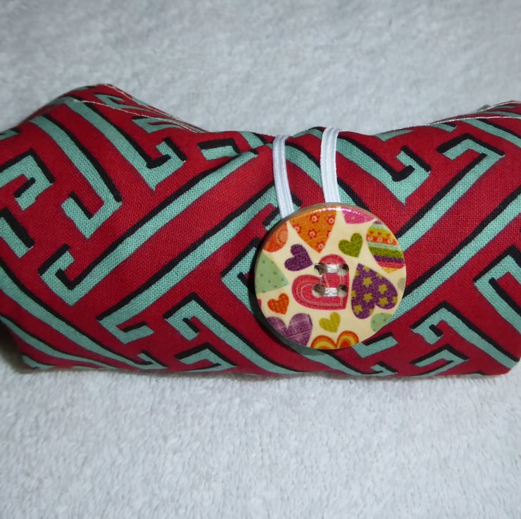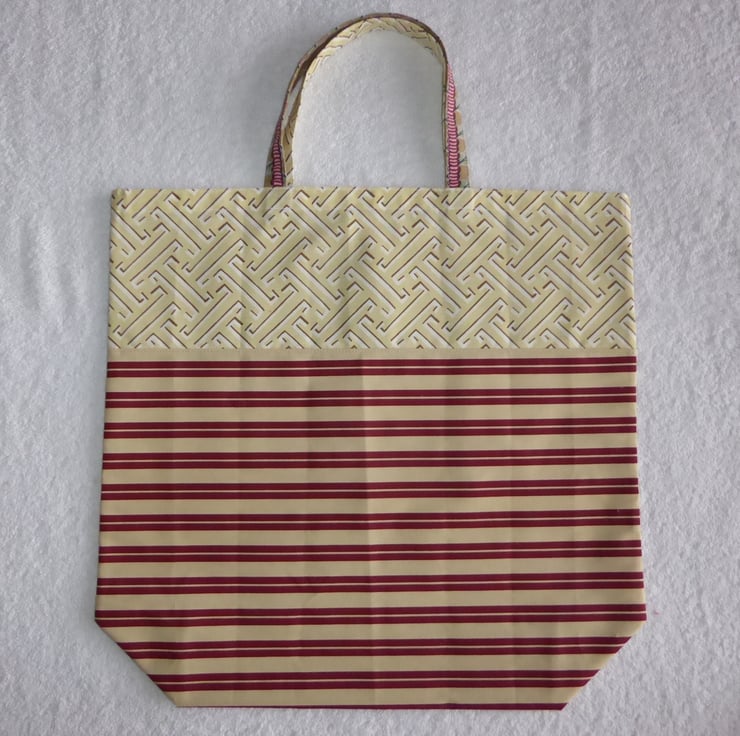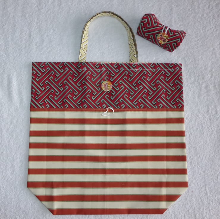 This useful bag has been created using complimentary print furnishing weight fabrics from a fabric sample book, to make a bright bag. It has been made from 100% cotton and measures w16.5" x h16" with a gusset of 5" and handle length of 14". There is an elastic and button closure so the bag can be folded and carried in your handbag. Instructions for folding are included. When folded it measures 4" x 2".