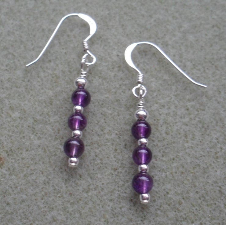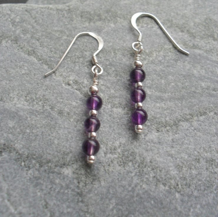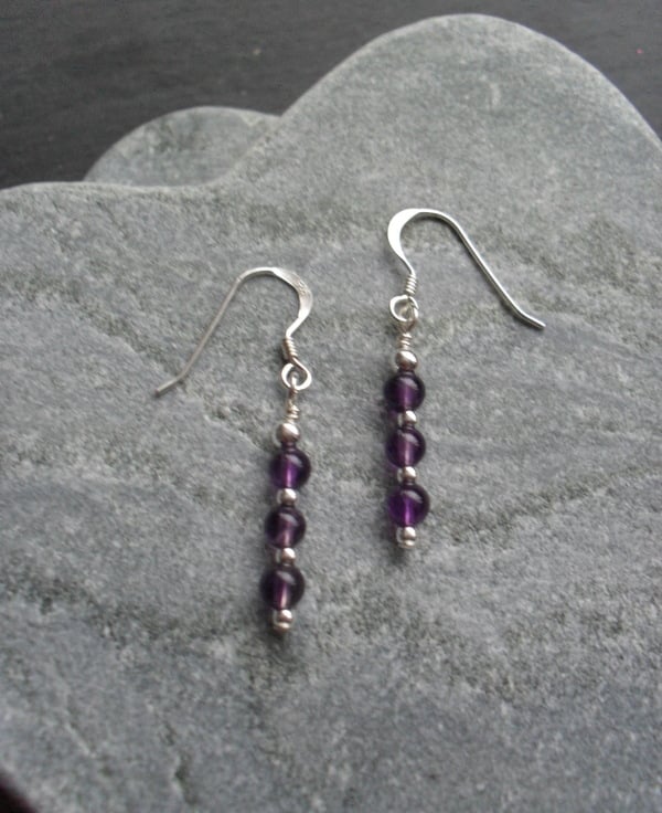 These dainty drop earrings are made using 4 mm amethyst beads and 2 mm and 3 mm sterling silver beads.