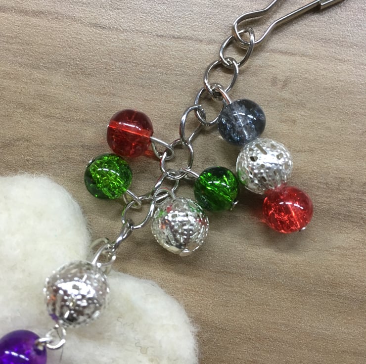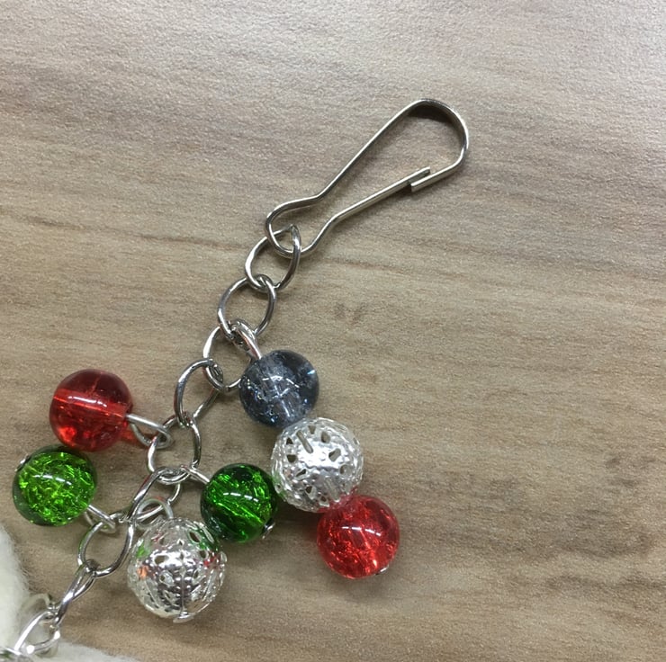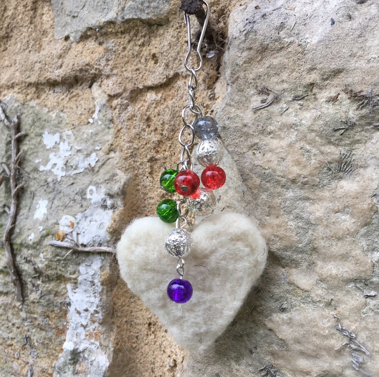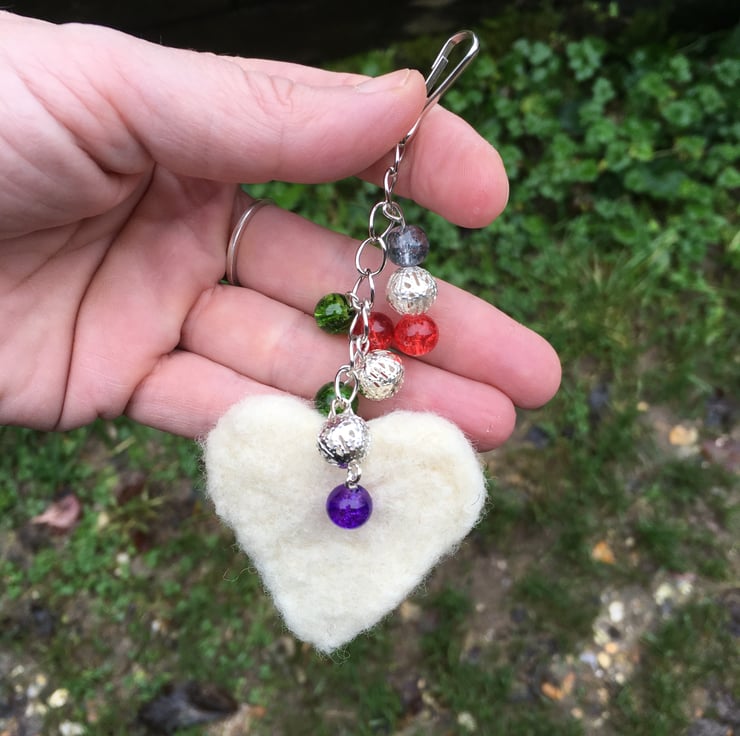 A simple white needle felted heart has been brightened up with a cluster of coloured beads on a silver coloured chain to make this adorable bag charm. The beads are coloured glass beads and silver coloured filigree effect beads. A spring clip fastener has been added to the end of the chain to provide simple attachment to a bag. The bag charm could also be used as a key fob or attached to a zipper pull.