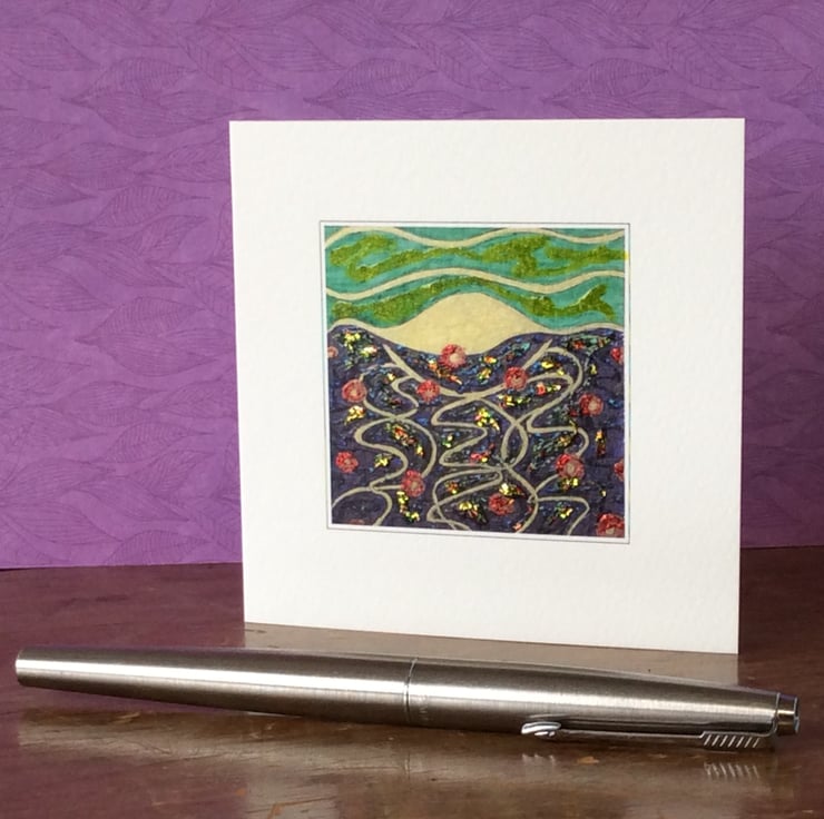 Original embellished square Art Card of the sun setting over the surface of water. It can be personalised by me. See my printed Card section for details. It is blank inside making it ideal for any occasion. It's printed on thick textured hammer off white card measuring 10 x 10cm. Comes with an envelop in a plastic cover for protection.