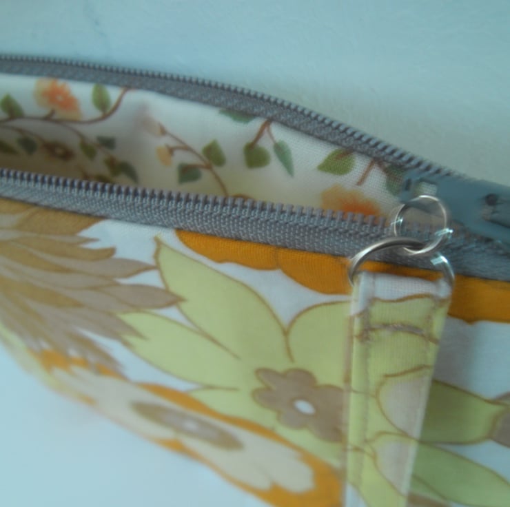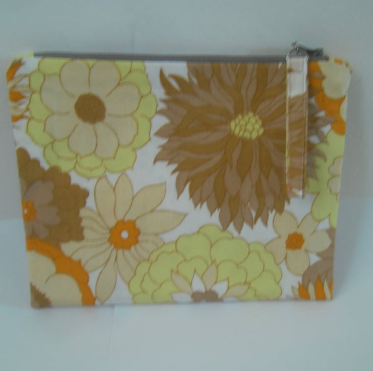 This make up purse is made using vintage poly/cotton fabric in a orange and yellow flower power print.