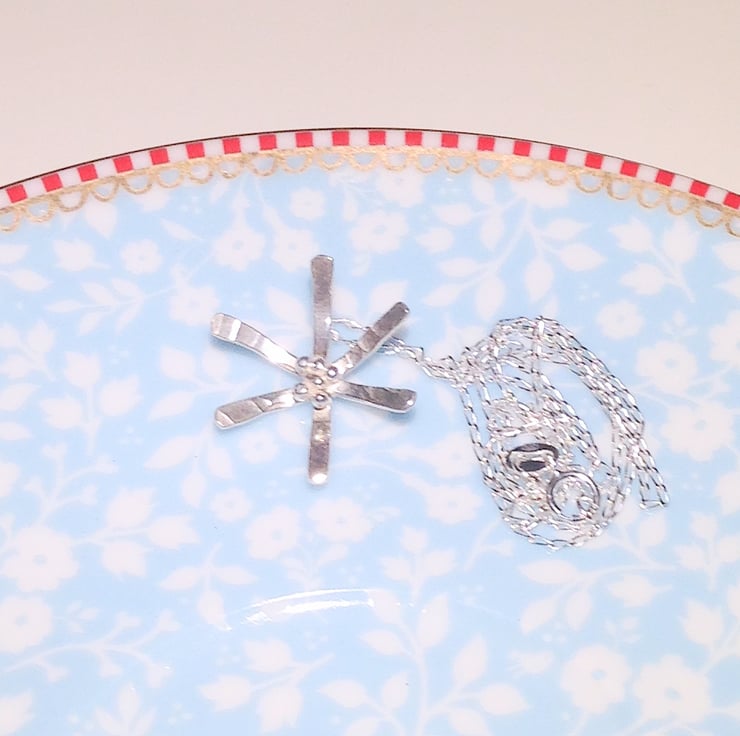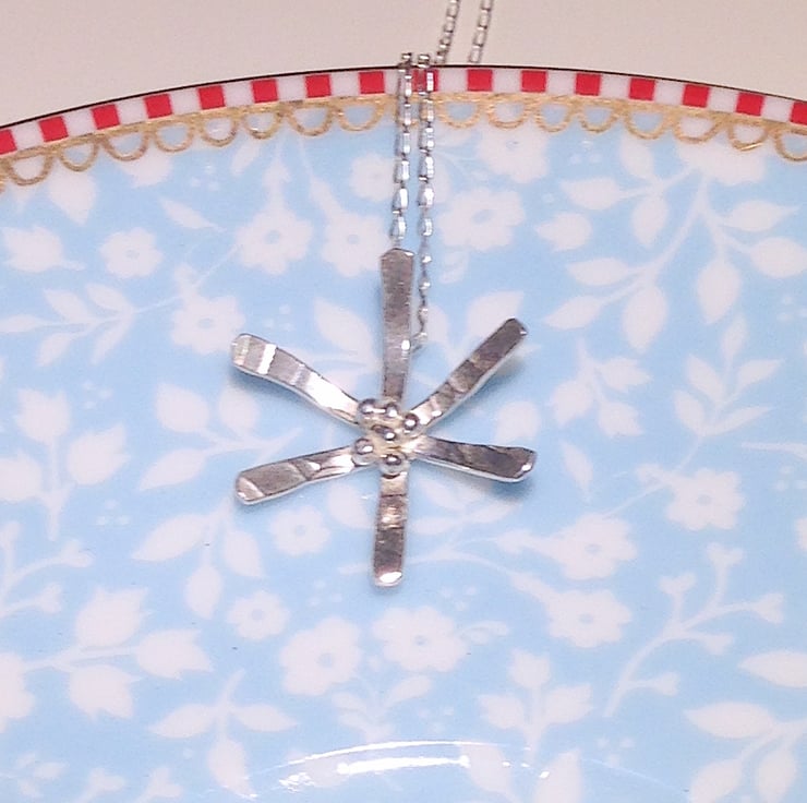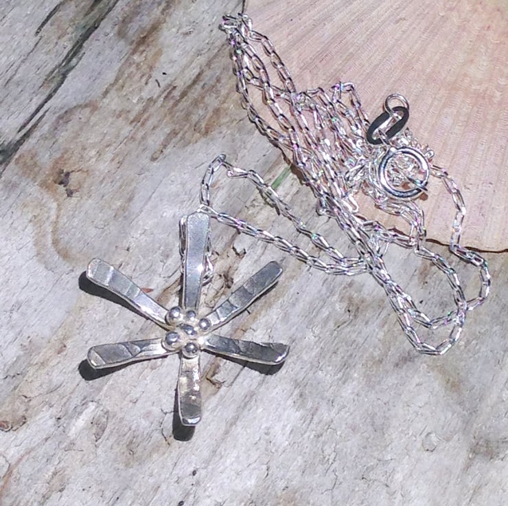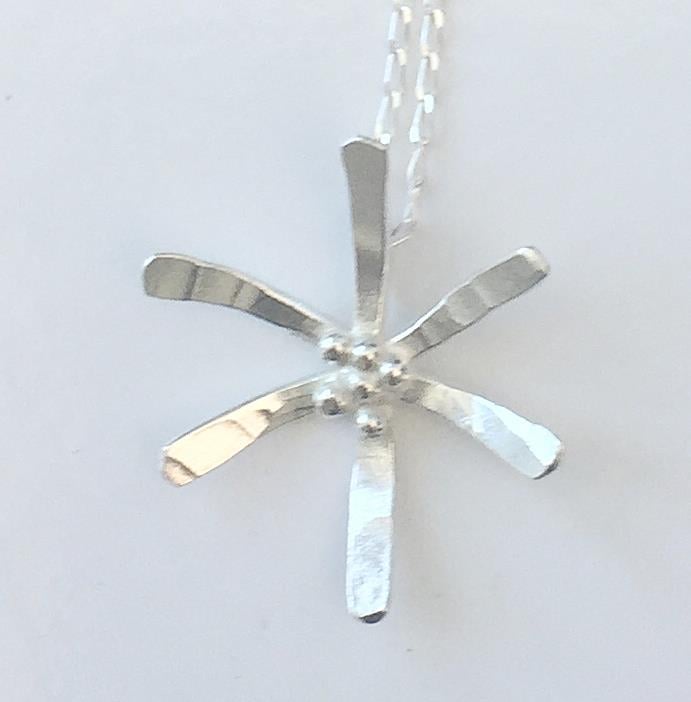 This beautiful flower necklace has been handmade in sterling silver. The pendant is approximately 2.5 x 2 cm with a hammered finish and is hung from an 18 inch sterling silver chain.