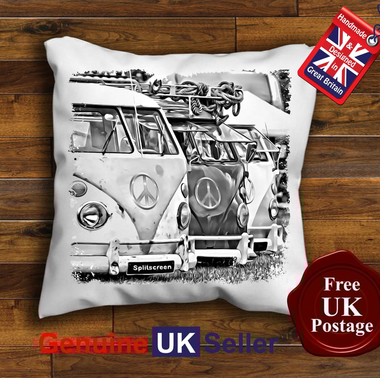 Our own unique VW Camper Split Screens model Unique Design Cushion Cover Handmade with a zip for cover removal. size 16 inch please Our Cushion covers are designed by us Aggies Bags and Photography Taken by Henri Mumford Photography covers are overlocked to give it strength and structure.