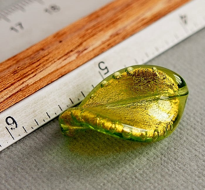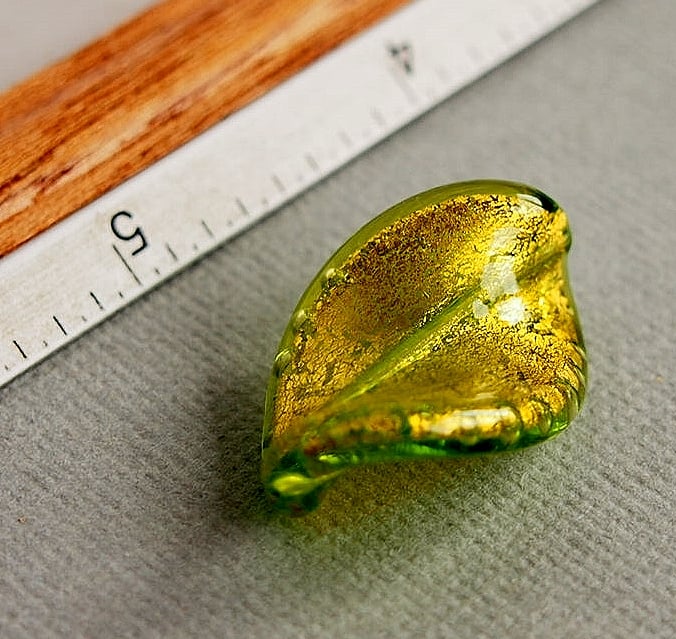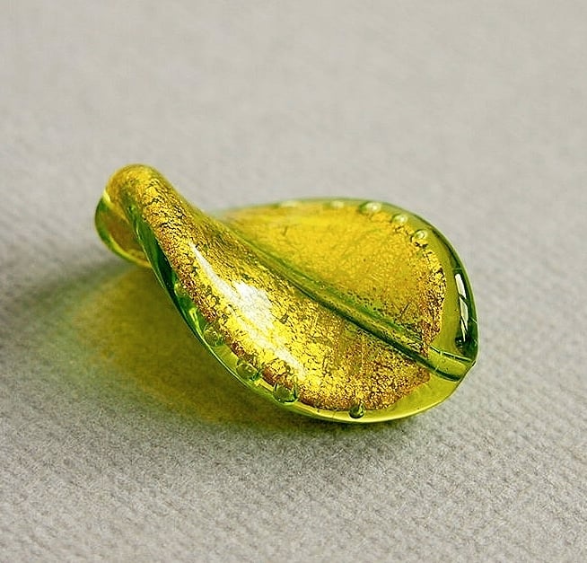 This lovely bead is lime/peridot green glass with a gold foil lining. Perfect focal for jewellery projects.