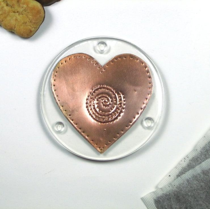 Slight seconds. Resin coaster containing a hand-embossed polished copper heart.