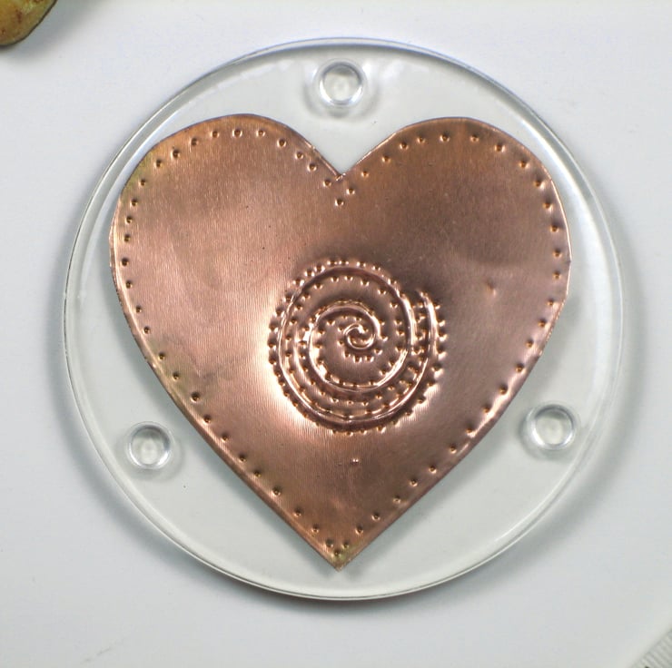 I have oxidised a sheet of copper, cut out a heart shape then embossed it with a spiral motif. Price when perfect £7.99.