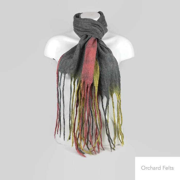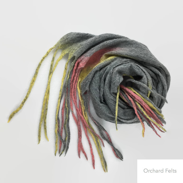The main body of this scarf has been made using natural grey merino wool fibres. Merino wool fibres in pink and yellow have been added at each end. The woollen fibres have been wet felted and long tassels formed at each end.