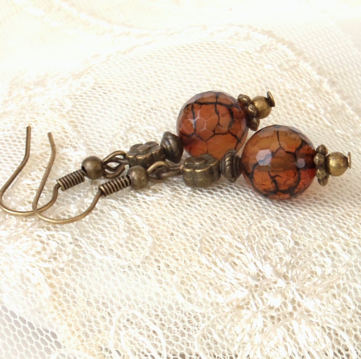 The agates hang with bronze beads on bronze earwires and have a drop of approximately 2.5 cms, as measured from the base of the earwires.