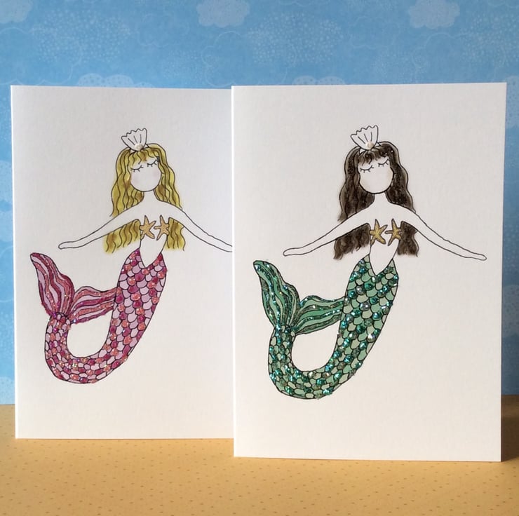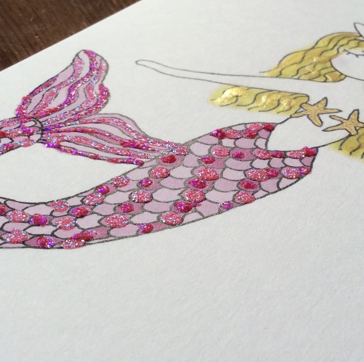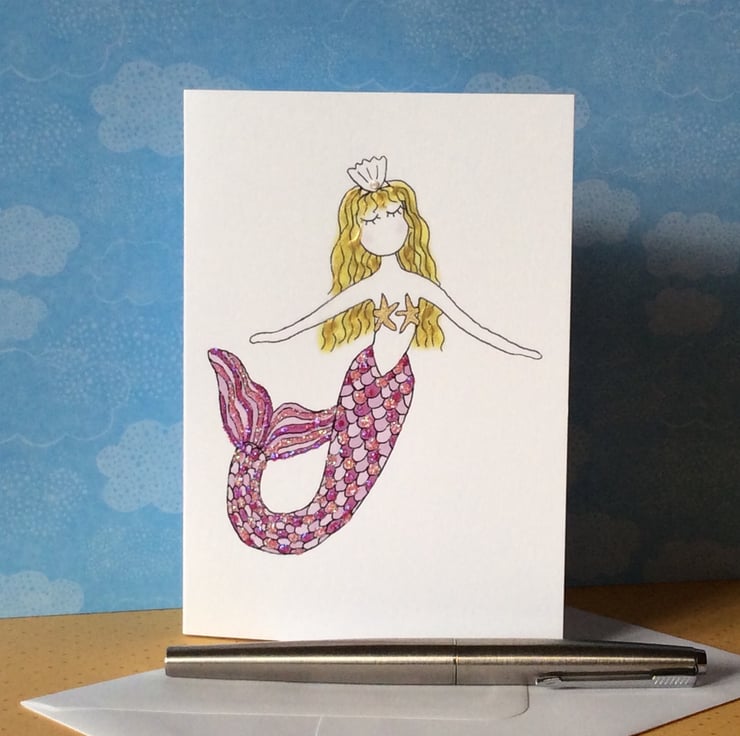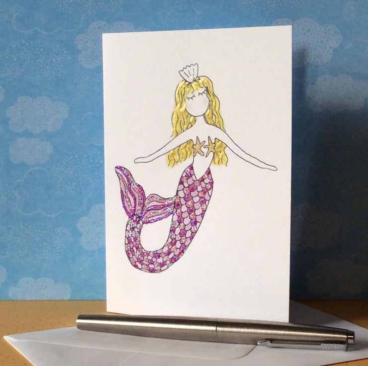 Mermaid card. Original design of a little mermaid called Pearl, with pink glittery tail and blonde hair (available as a brunette as well). On the back of the card is a little story. The card is blank inside and can be personalised by me, see printed Card collection for details. It is white 300mg thick, and it comes with an envelop in a plastic packet to keep the card clean. The card is A6, which is 10.3 x 14.7cm.