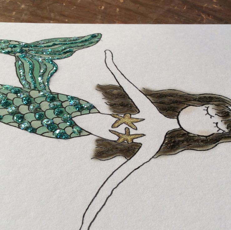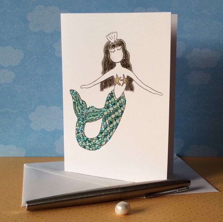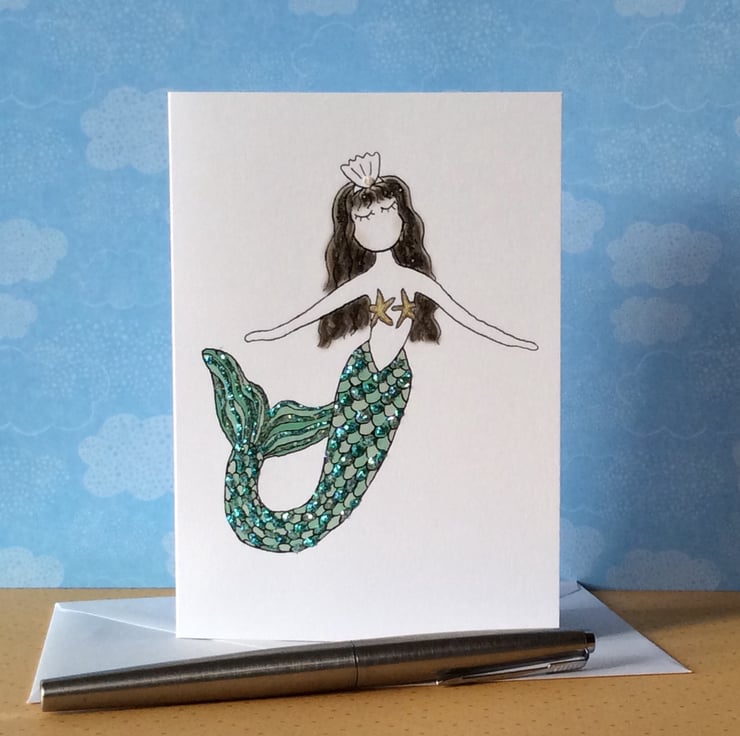 Mermaid card. Original design of a little mermaid called Pearl, with green glittery tail and brunette hair (available as a blonde as well). On the back of the card is a little story. The card is blank inside and can be personalised by me, see printed Card collection for details. The card is white 300mg and it comes with an envelop in a plastic packet to keep the card clean. The card is A6, which is 10.3 x 14.7cm.