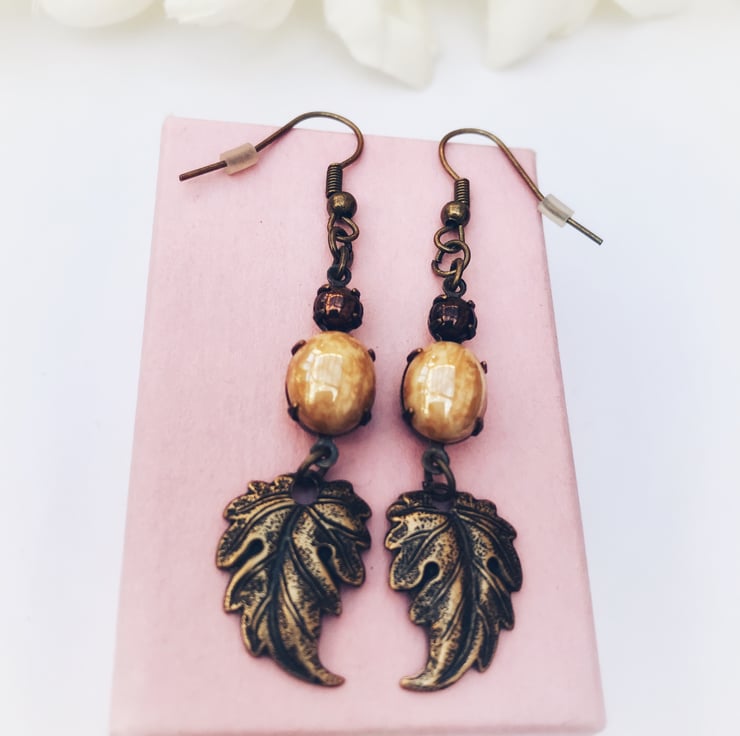 Vintage glass stone earrings in pearlish beige and copper set in antique brass settings. Hung from the earrings are brass leaves.