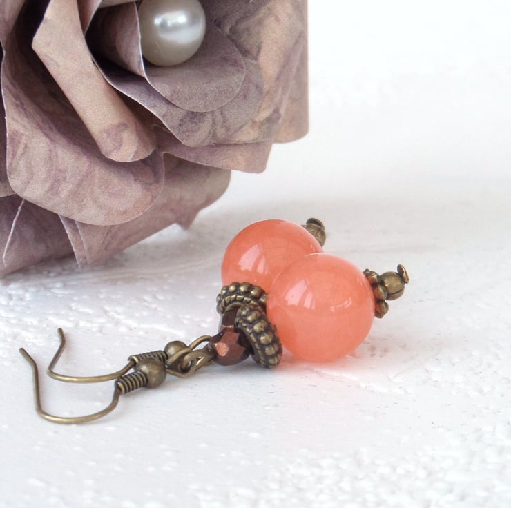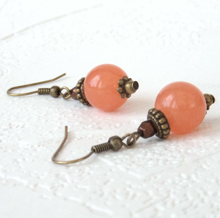 Pretty jades in a soft shade of orange hang from bronze wires with fire polished brown crystals to give a vintage effect to these earrings.