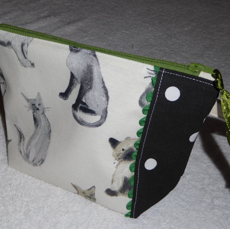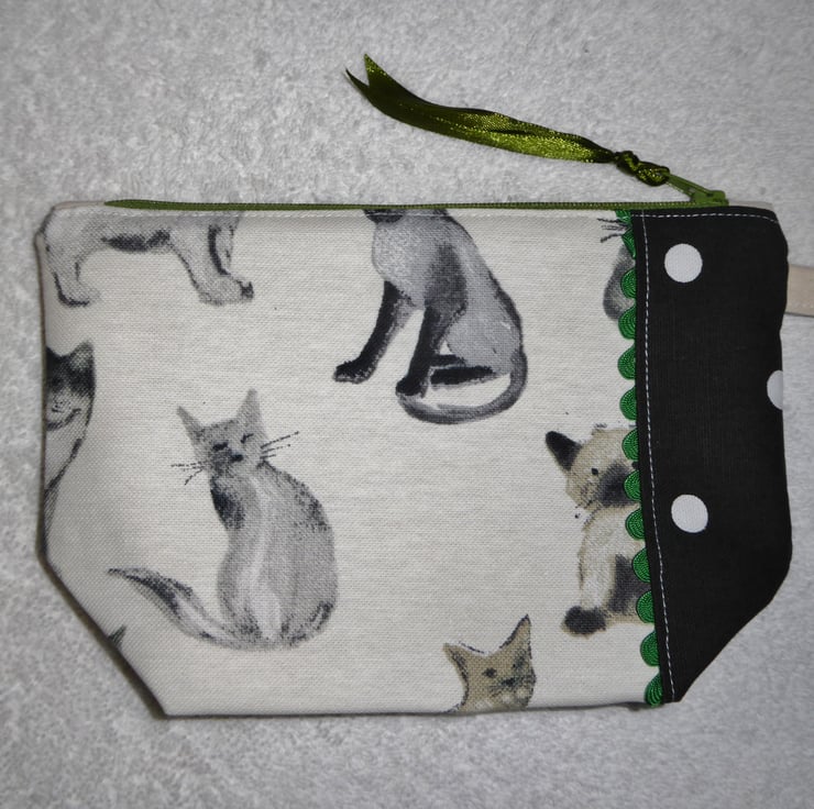 Cat Print Zipped Purse. Fully Lined with Gusset and Zip Pull. Ric Rac Trim