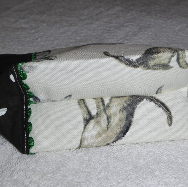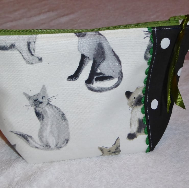 This lovely little purse has been created from a cat print furnishing weight cotton fabric. It has been embellished with a complimentary polka dot print edging and ric-rac trim. It is fully lined and has a zip closure, with a ribbon pull.