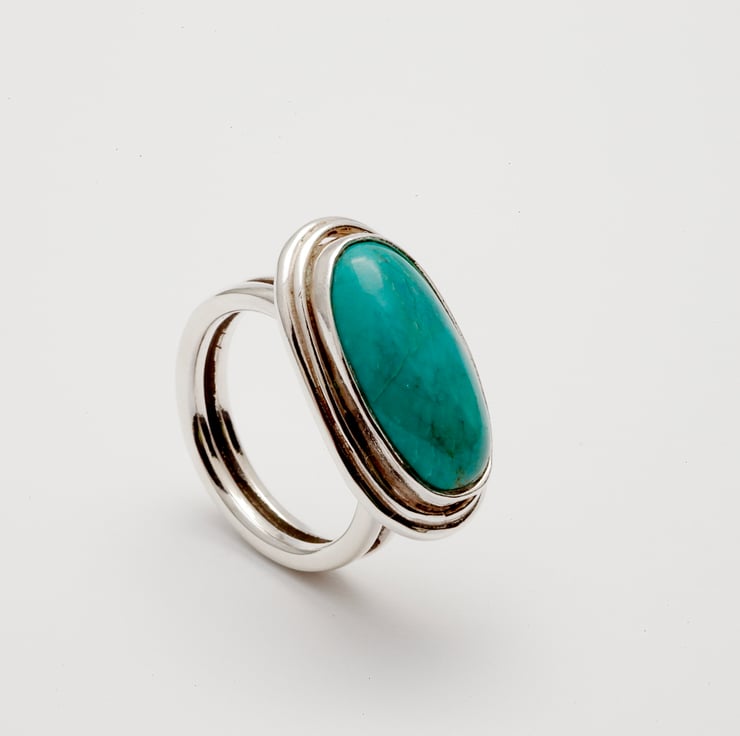 This oval Chinese turquoise cabochon measures 20 x 10 mm and is mounted on two bands of 1.5 mm round wire.