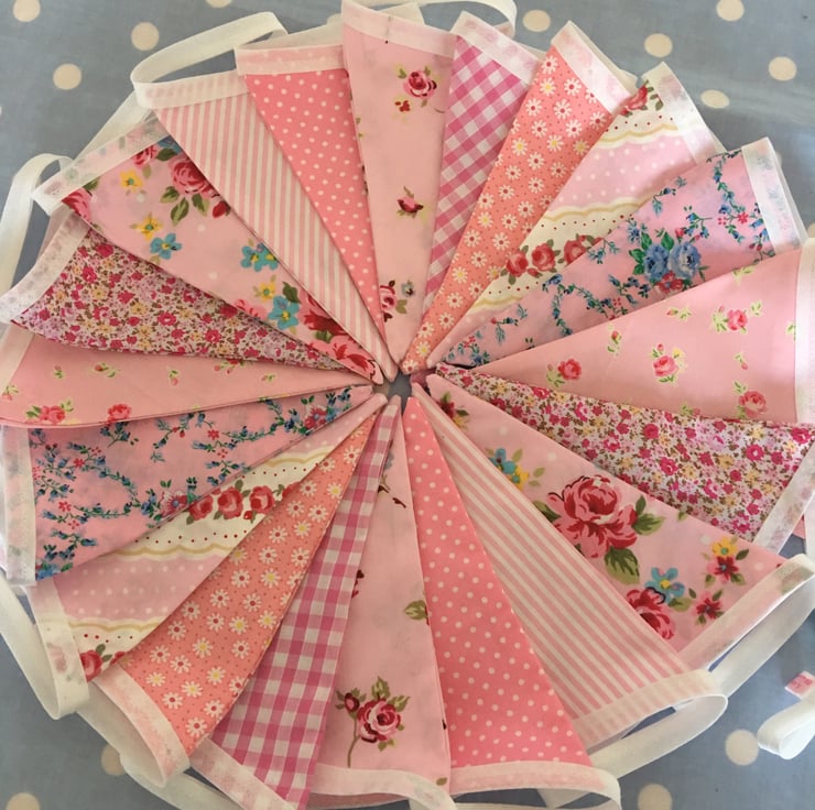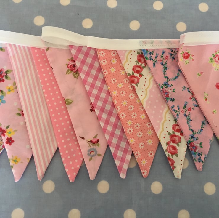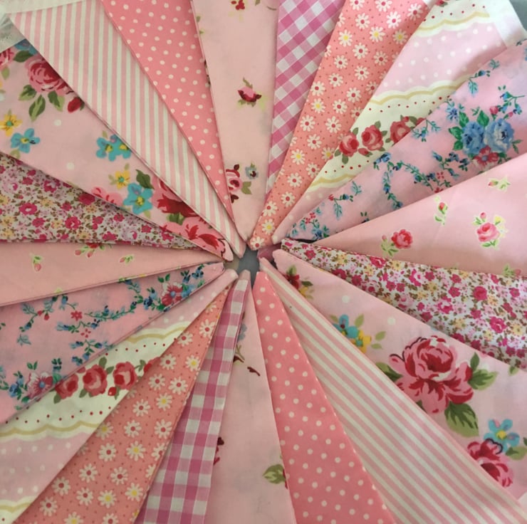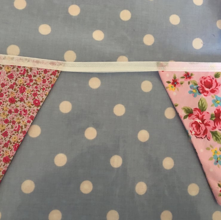 10 ft Gorgeous bunting, each flag is 7" tall, double sided so the same fabric on the back and made with cotton fabrics then finished with white bias binding