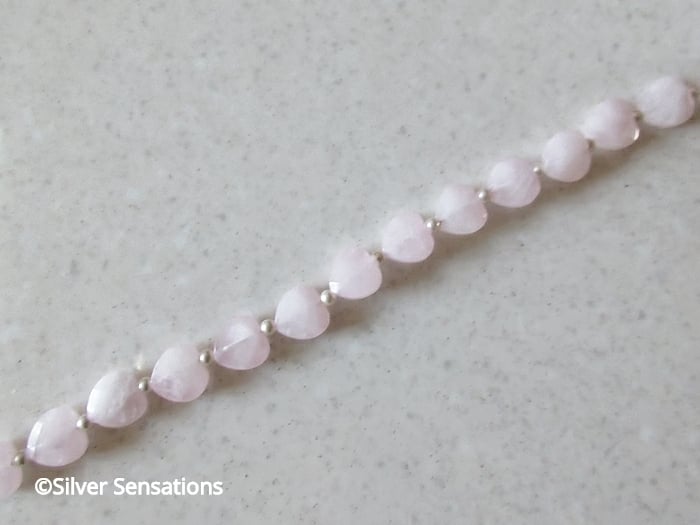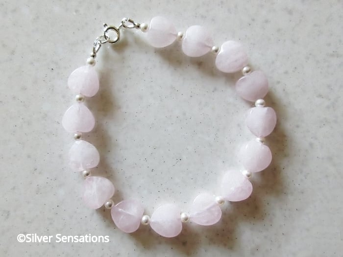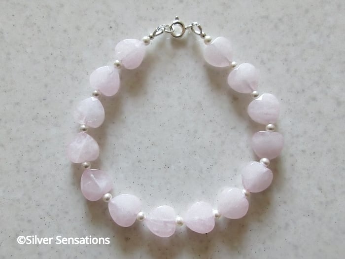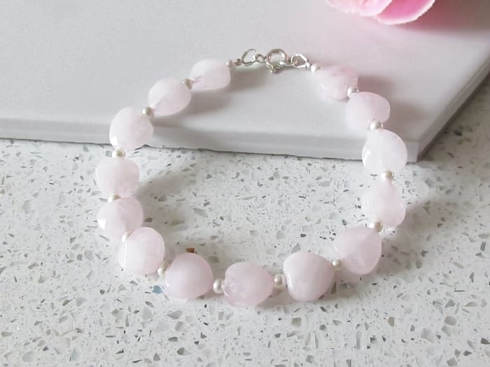 This baby pink Rose Quartz faceted heart beads & premium quality pearls white bracelet oozes romance & elegance.