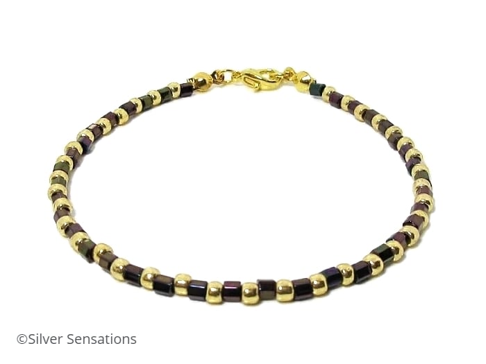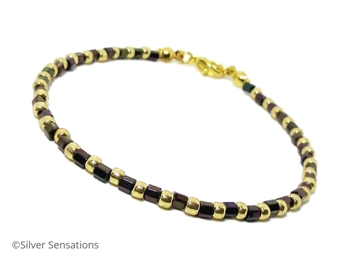 This slim purple & gold coloured seed beads layering bracelet is perfect as a friendship bracelet or for stacking with other bracelets.