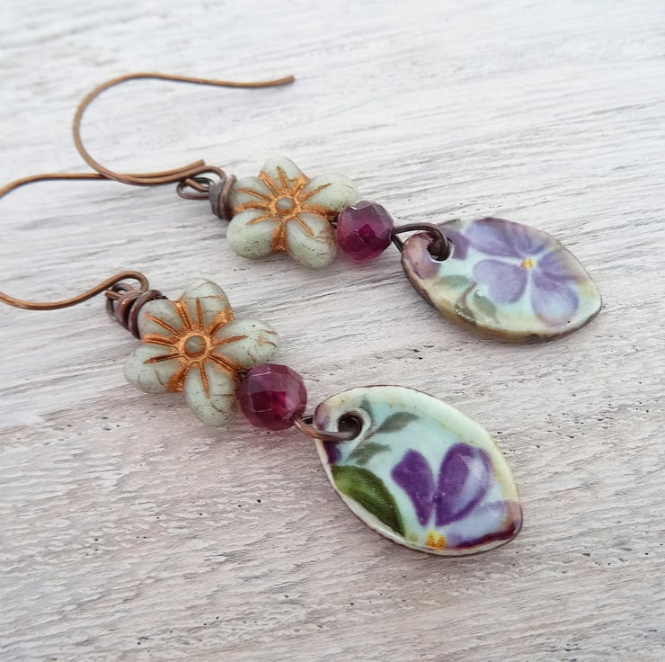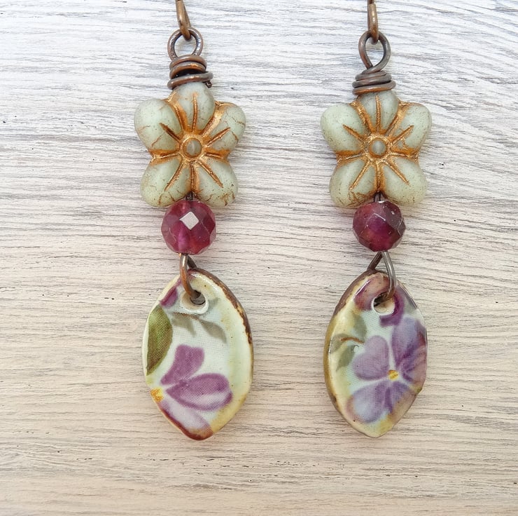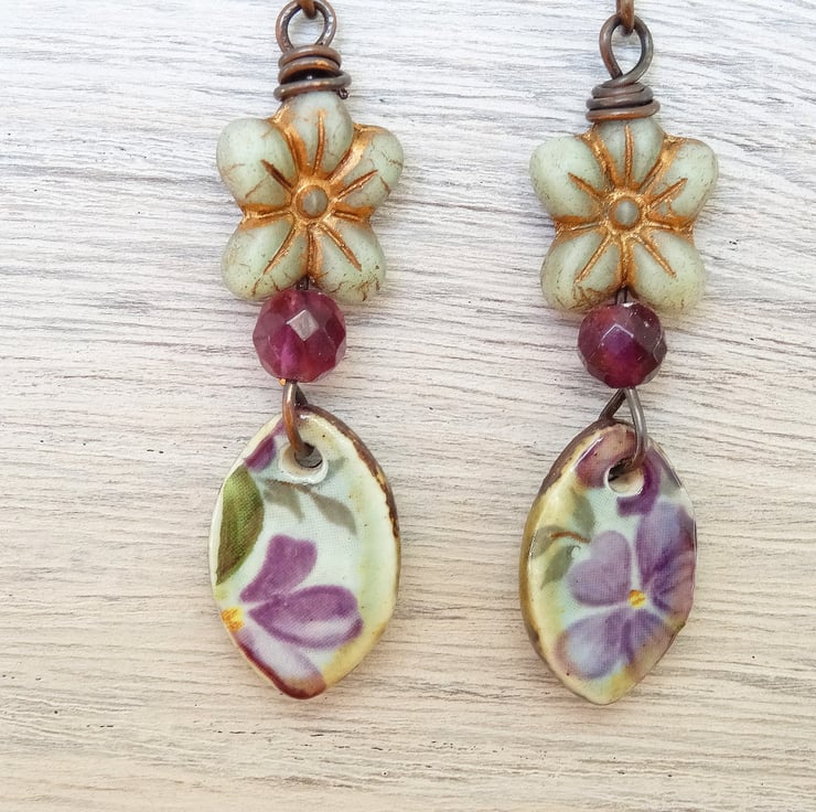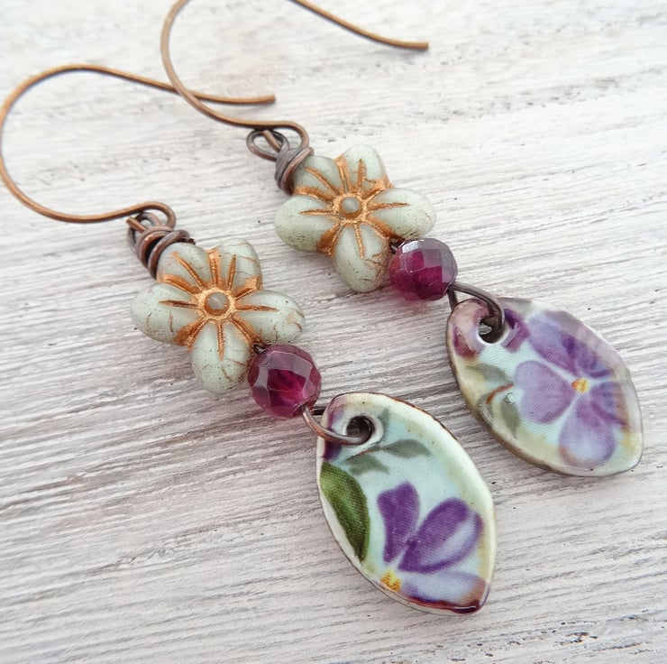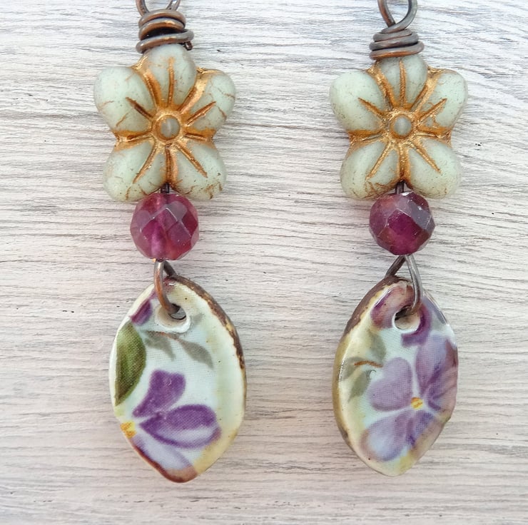 These earrings are so pretty,I have made them using handmade ceramic drops in lilac and mint with a lovely floral pattern. To these I have added 12 x 13mm czech glass daisies in a antique mint colour and a 4mm faceted fluorite bead. The earrings measure 2.25 inches (just under 6cm) from top of vintaj brass, round loop, nickel free earwires.