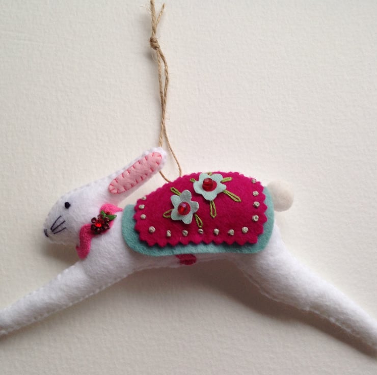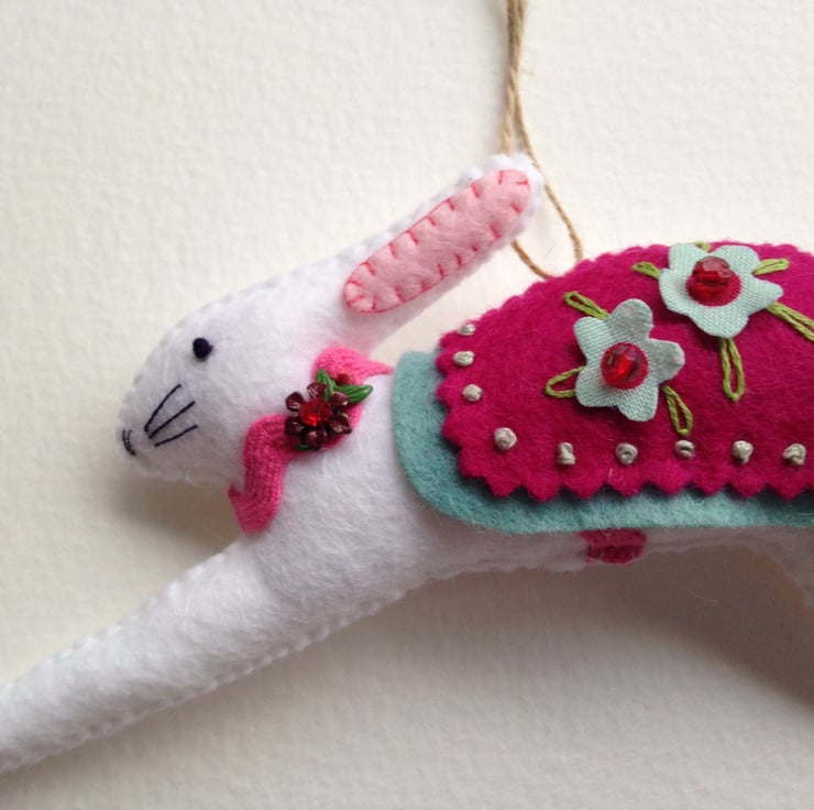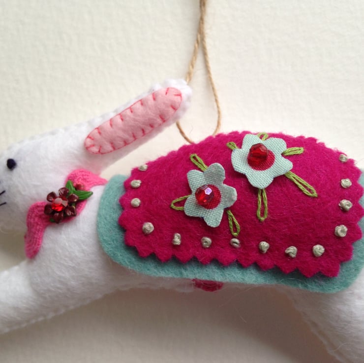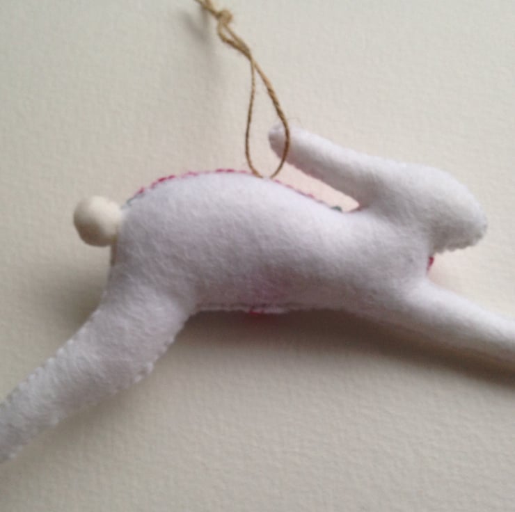 I have designed and hand sewn this white rabbit. It measures 16cm long, is 5cm high and 2 cm thick. It is made from felt and is filled with toy stuffing. It is decorated with ribbon, beads, felt and embroidery on one sides X has a small fluffy tail. There is a loop of string to hang it by.