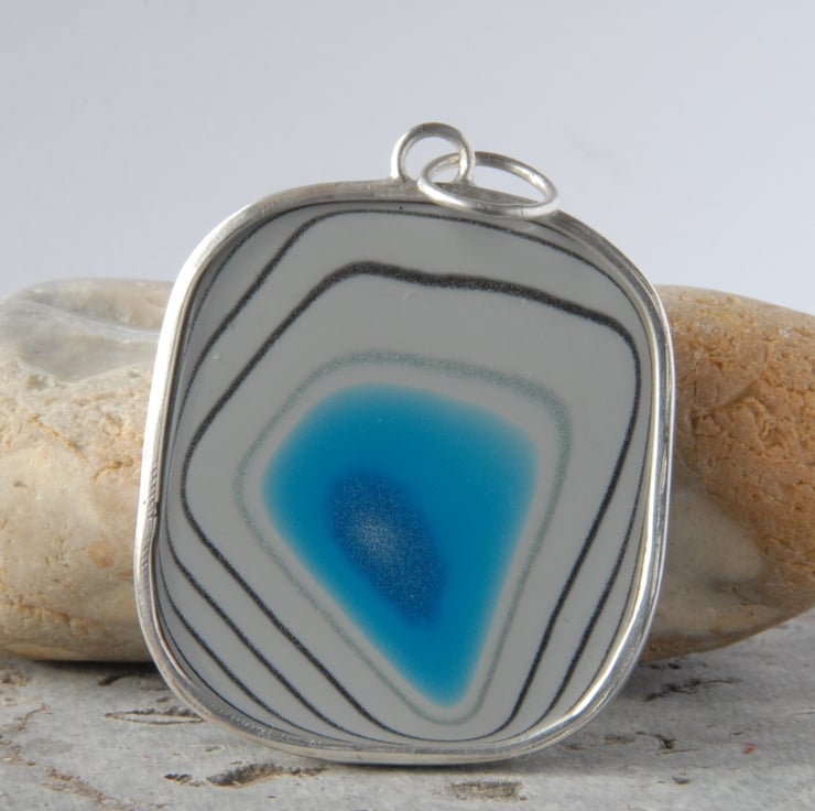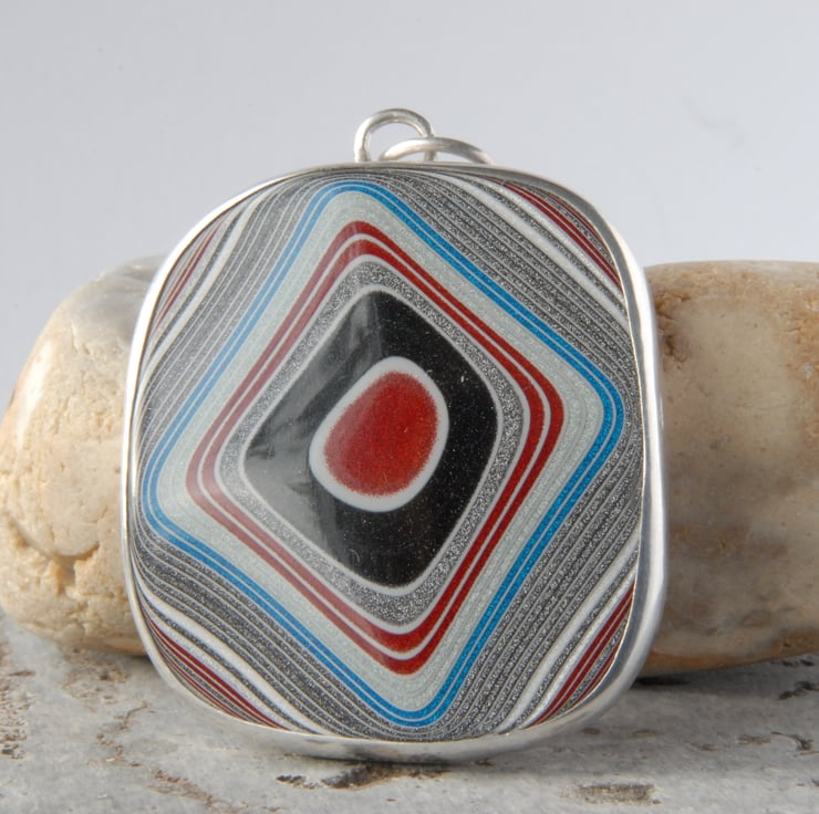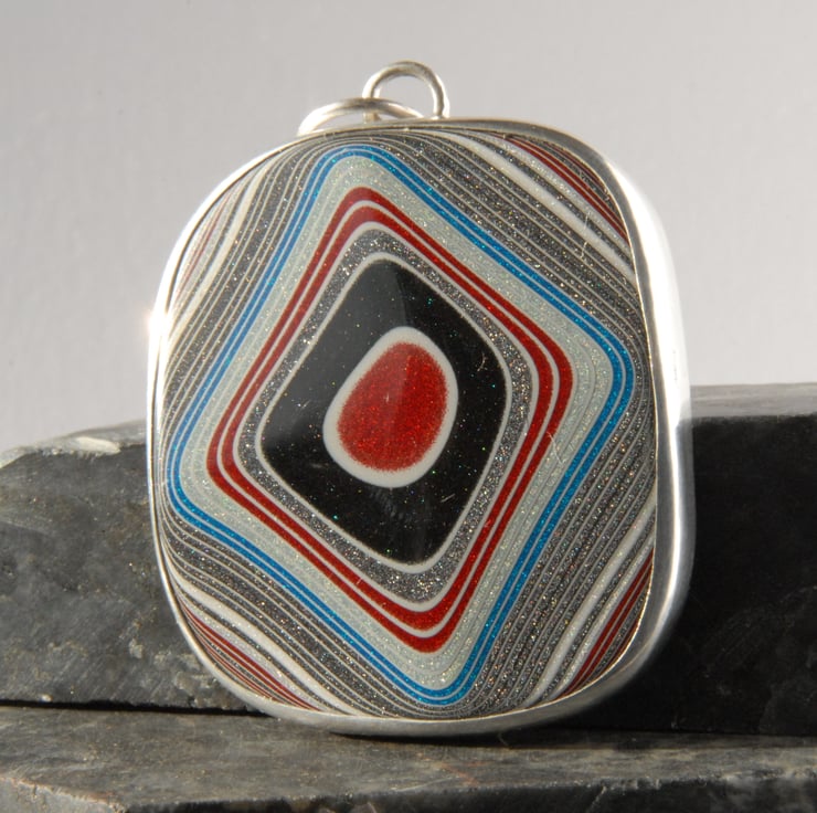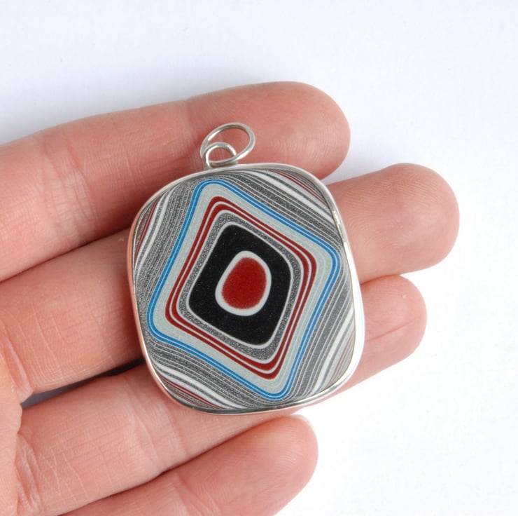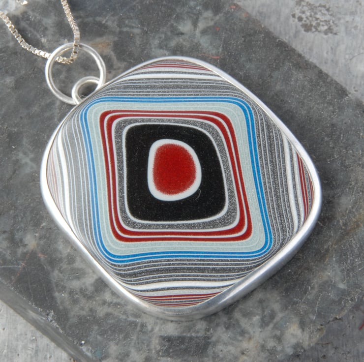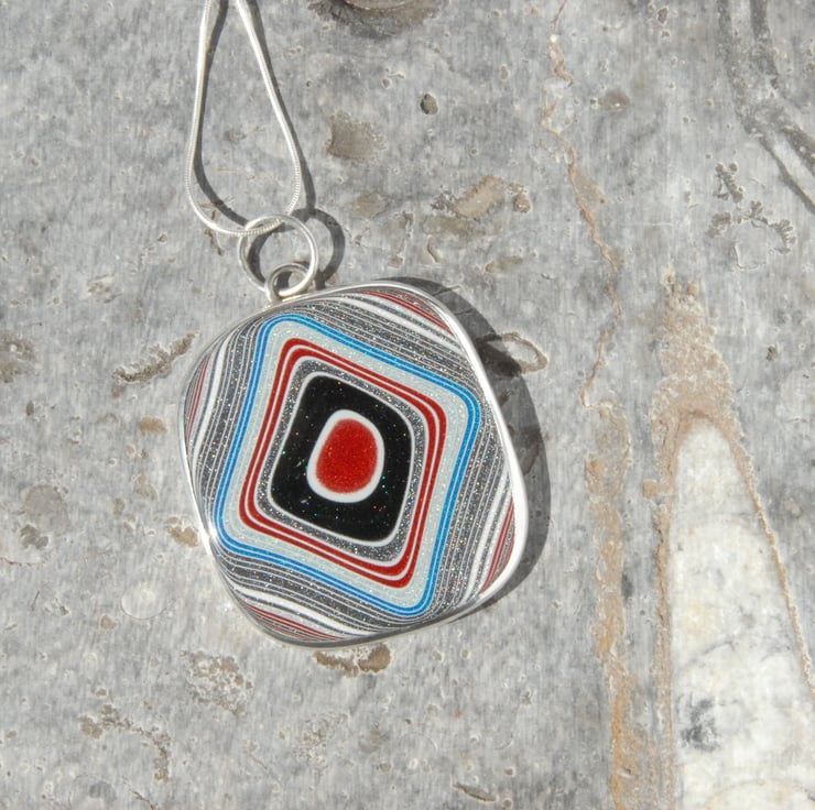 This super sparkly pendant features a square cabochon of fordite bezel set in sterling silver. The fordite has been polished to give it a pattern of sparkly diamonds layered on top of each other in shades of silver grey, bright blue, cherry red, black and white, it is set in an open back setting so that it can be worn either way round and the back is predominately pale grey with bands of sparkly dark grey and a bright blue splodge. Very striking and eye catching so you are sure to get comments about it but this is a unisex design that I think could be worn by anyone day or night.