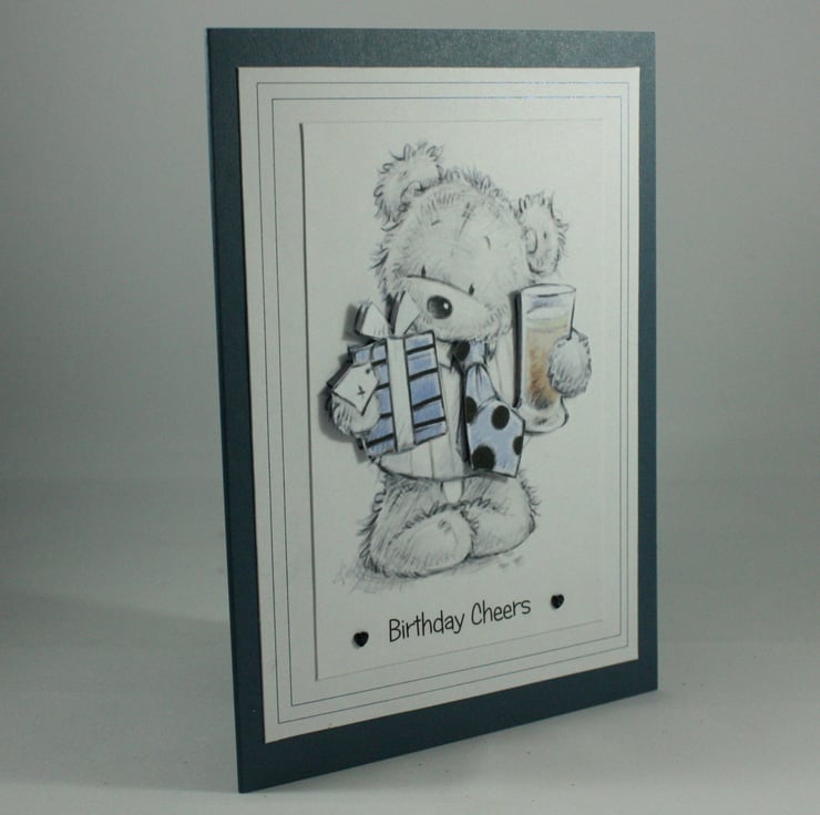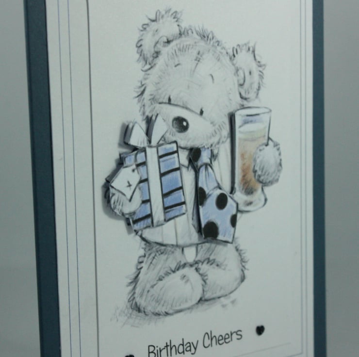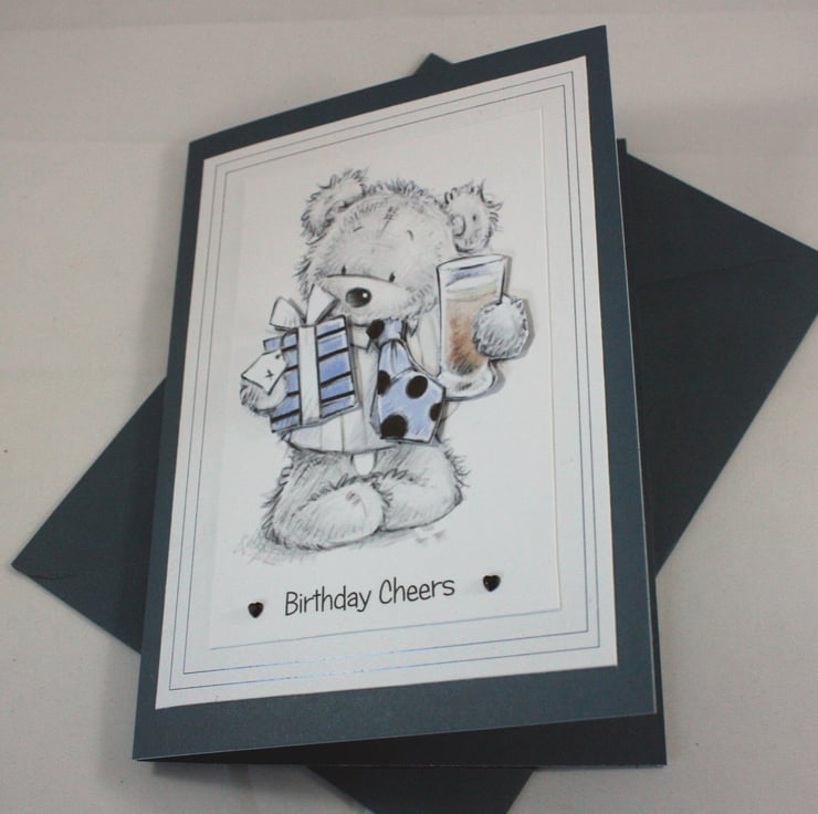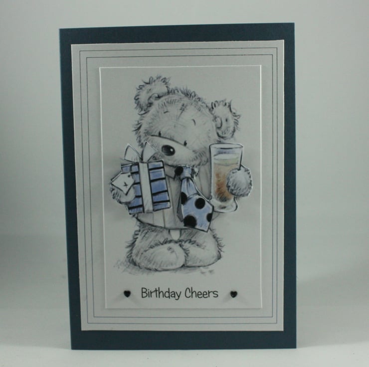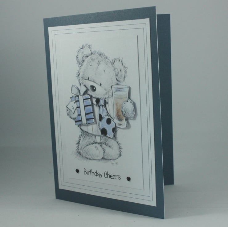 The image has been layered over white card with a blue foiled border, the message 'Birthday Cheers' printed on and finished with two small, black gems.