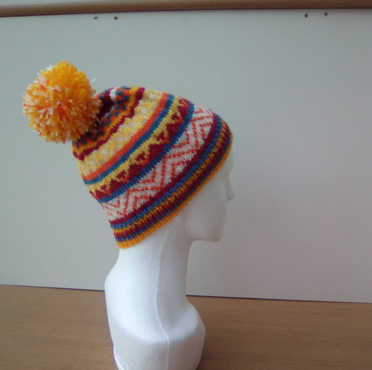 Hand knitted using 6 colours: ivory; lemon; yellow; orange; blue; brick red