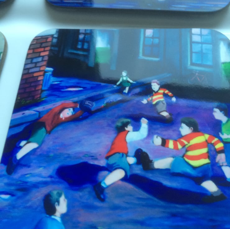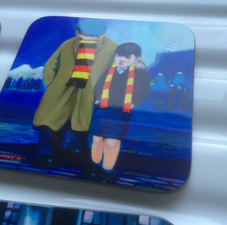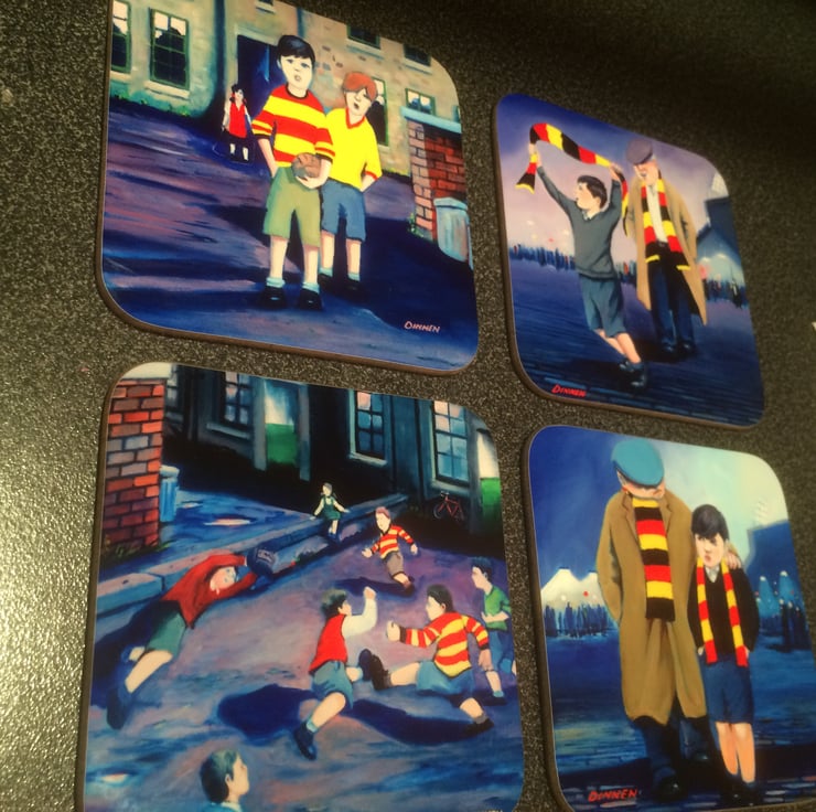 From my own football artwork and paintings - a set of four high gloss quality football coasters that will have massive appeal to the football fan and be a great wee unique gift for whether it be a birthday gift , a Christmas gift or maybe just a wee special treat for being that special guy or lady in your life who deserves a treat.