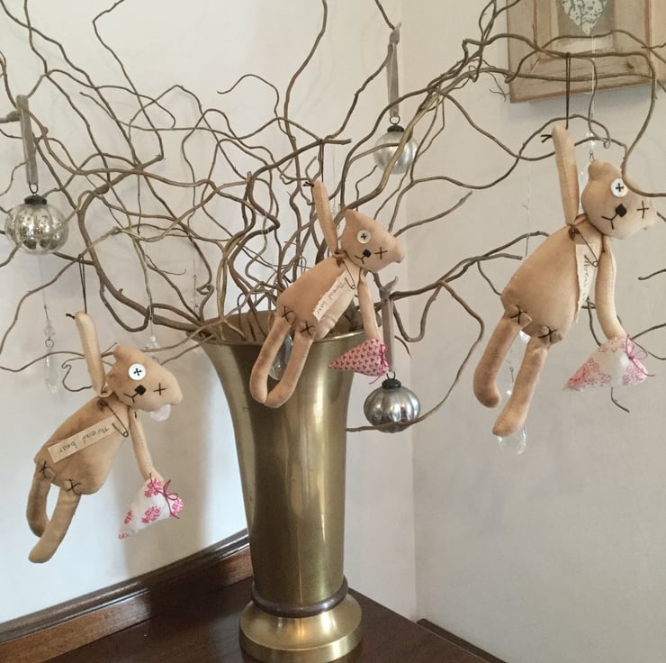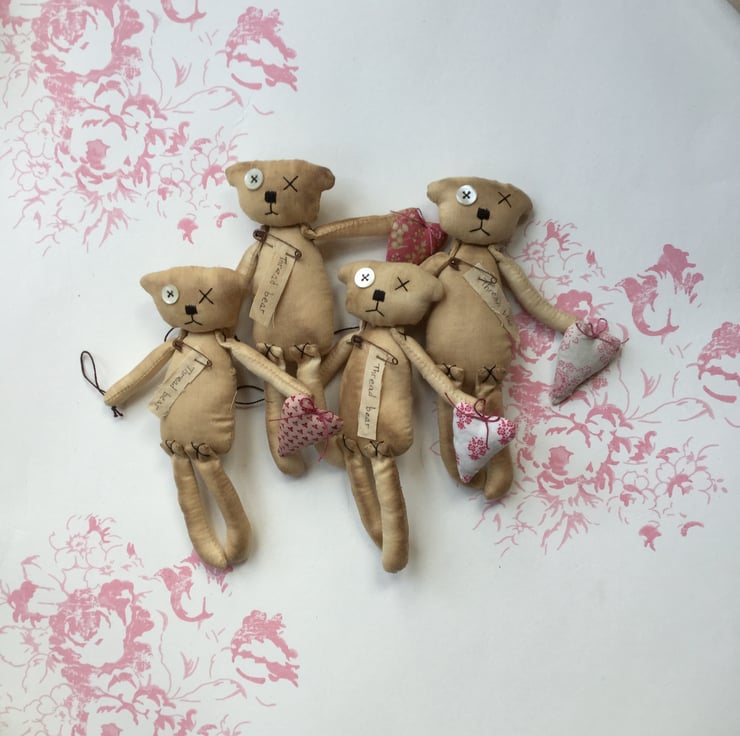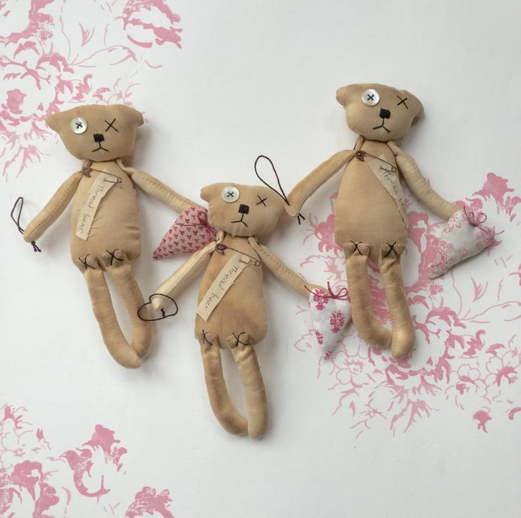 Each bear is made from tea/coffee stained cotton to give them an aged appearance. The limbs are attached with X-stitch and the facial features, with one pearl button, are also hand stitched.