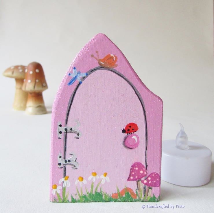 The Door is hand cut from mdf and handpainted with toadstools and little insects.