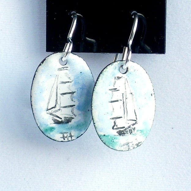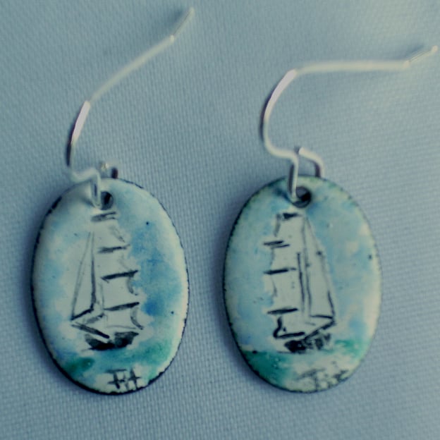 This pair of earrings features my painting of a tall ship at sea. After building up several layers of white enamel on the copper oval, to provide a base on which to paint, I have painted the pictures, using tablets of finely ground enamel, soluble in water, to produce a glaze over the white. When the picture was finished I fired it as I would any other enamel piece but taking particular care not to overfire and so burn out the thin layer of glaze that makes the picture, The work I do in this way I sign with my initials, FH. This signature may be seen at the bottom of the two pictures that make up the earrings.