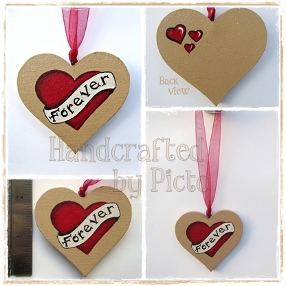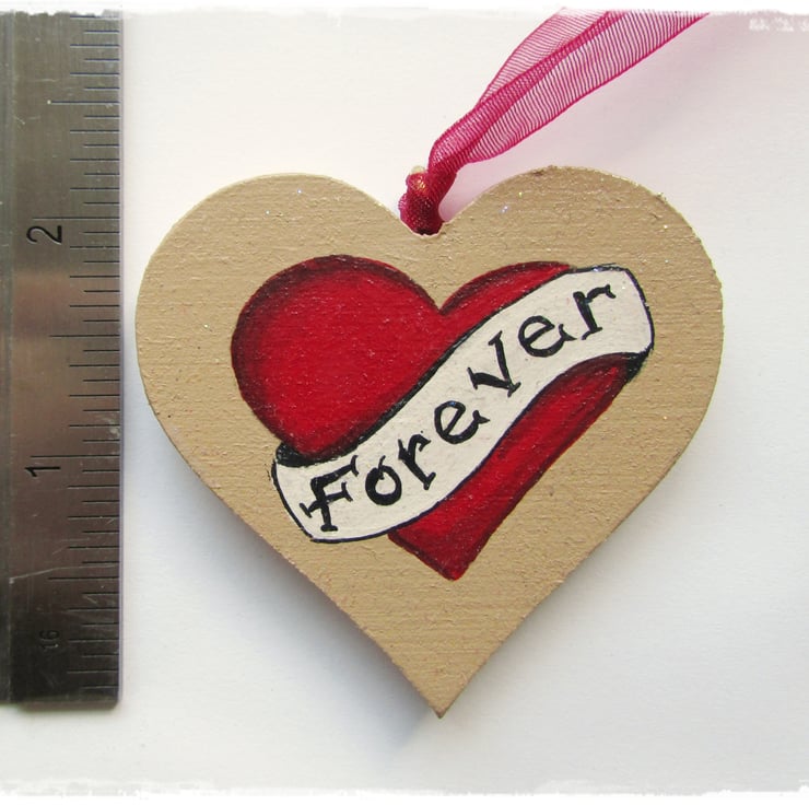 Painted in a lovely caramel with a Deep Red Heart and a Cream coloured banner with the word Forever' painted on. There are 3 small hearts painted on the back.
