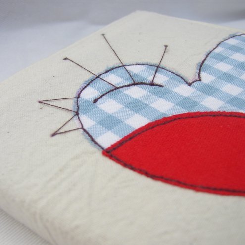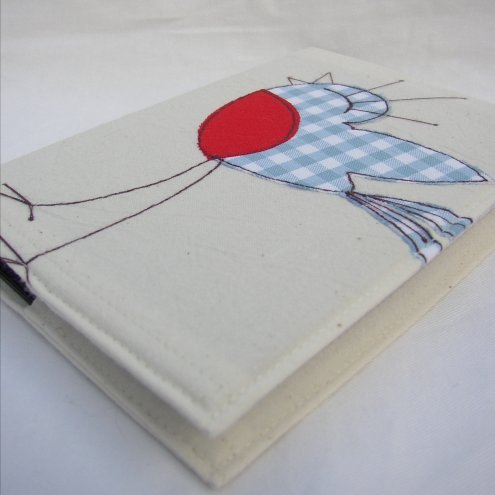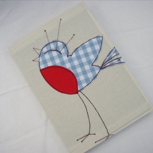 this unique embroidered notebook features a happy, red chested, pale blue gingham sparrow on the front cover.