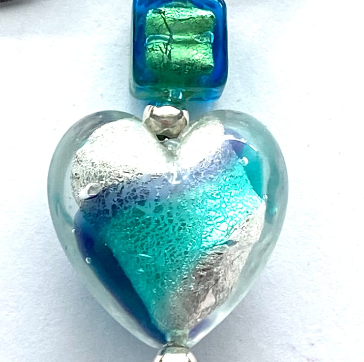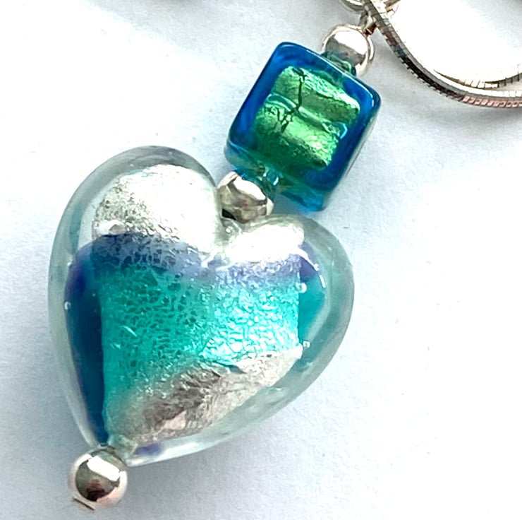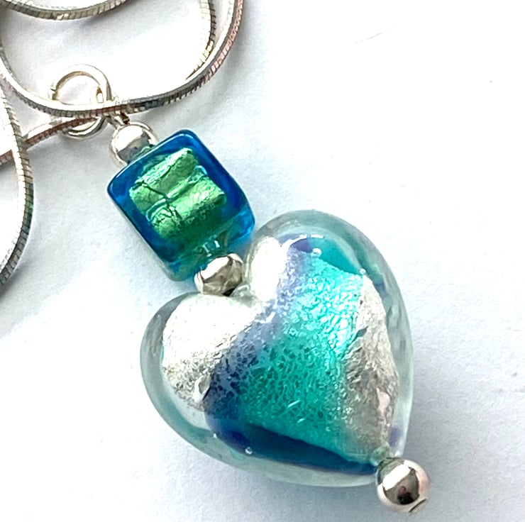 Murano glass pendant with a purple and verde white gold foiled Murano glass heart (20mm) and Murano glass verde emerald gold foiled cube bead with sterling silver round beads. The pendant hangs from a sterling silver chain (18ins). The pendant measures 30mm in height and is presented in a pretty gift bag all ready for giving.