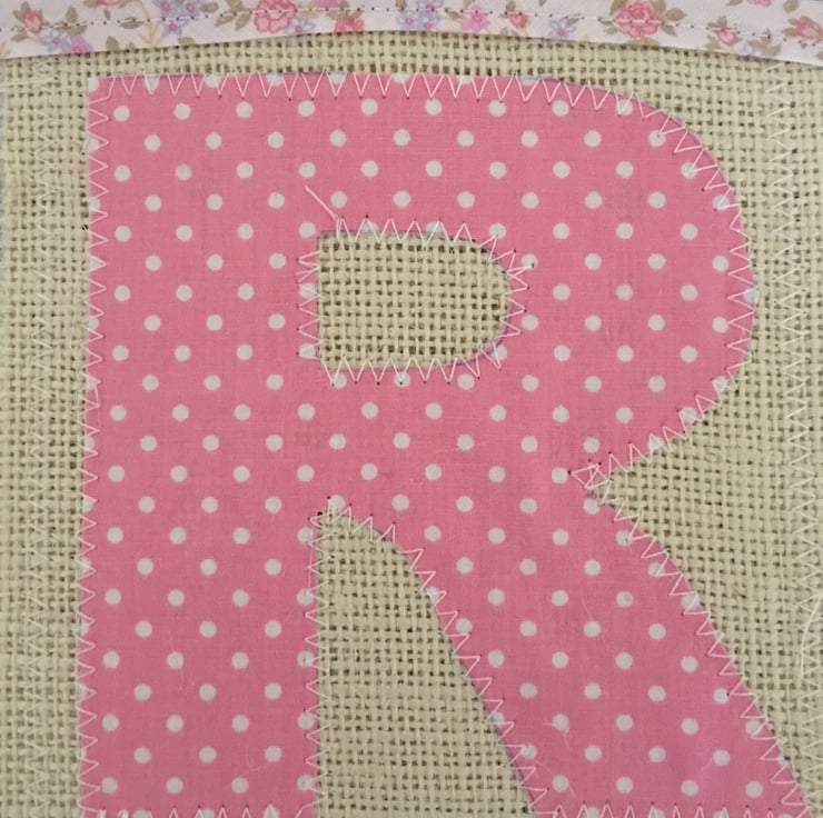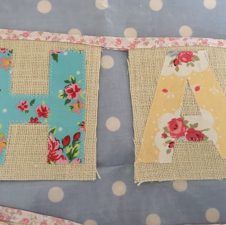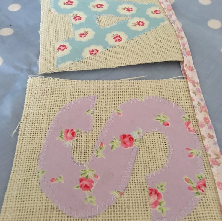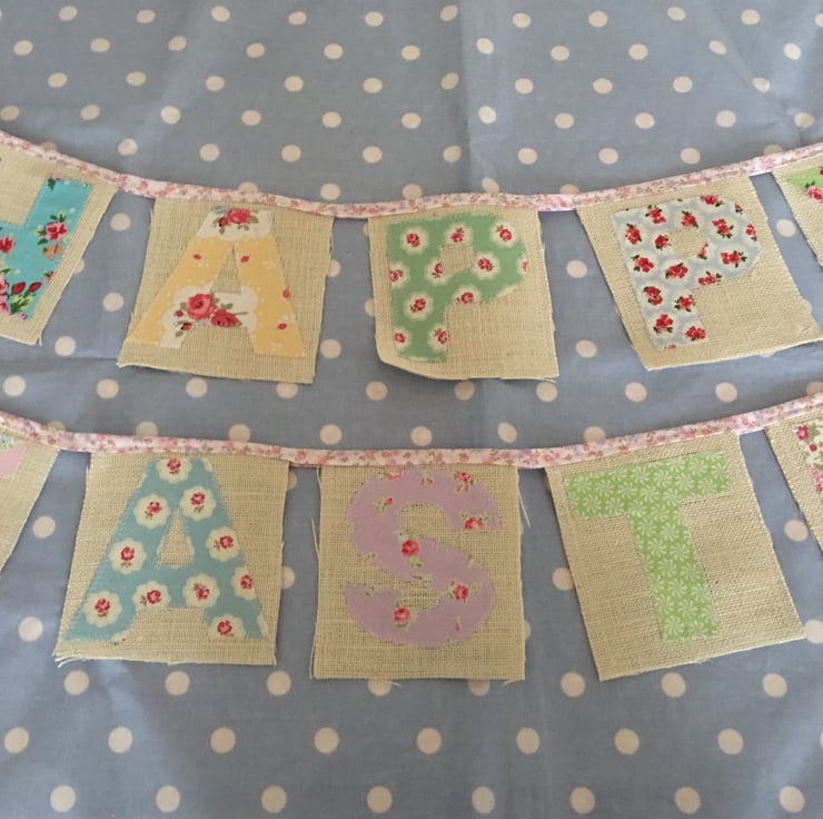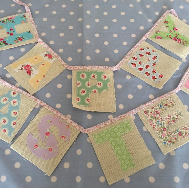 Gorgeous Easter bunting with hessian and cotton fabrics then finished off with pale pink floral bias binding