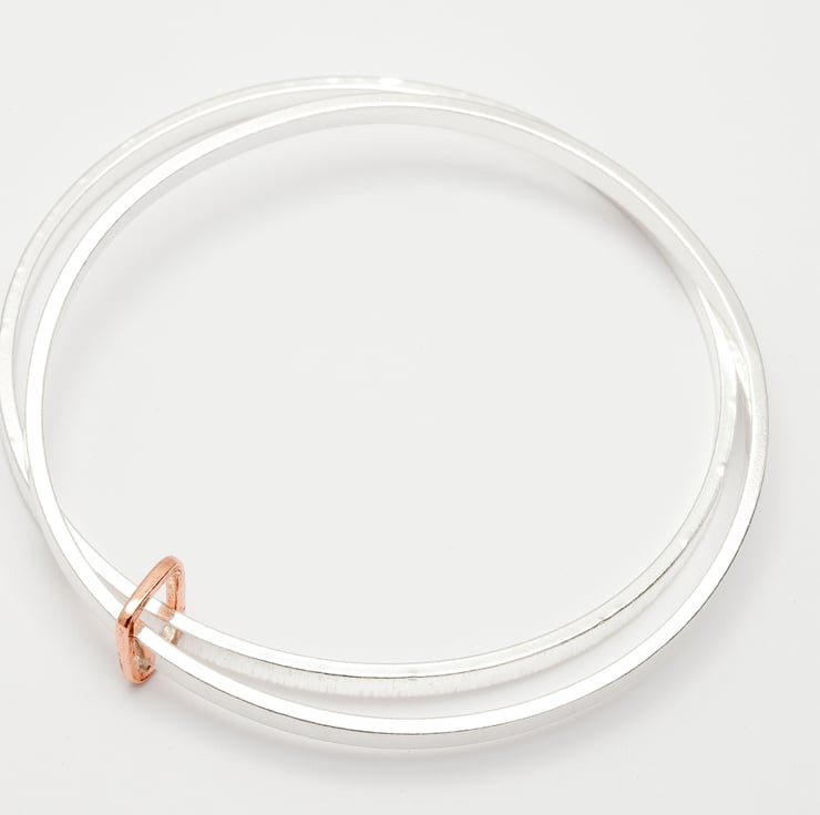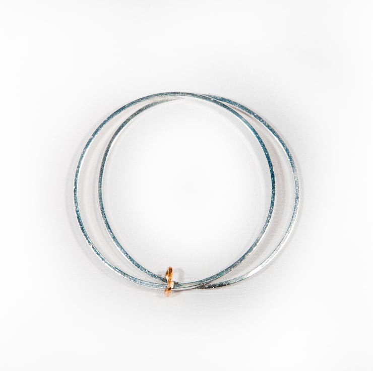 Pair of sterling silver bangles made using 3x2mm rectangular wire and held together by a flat rectangular link in yellow gold.