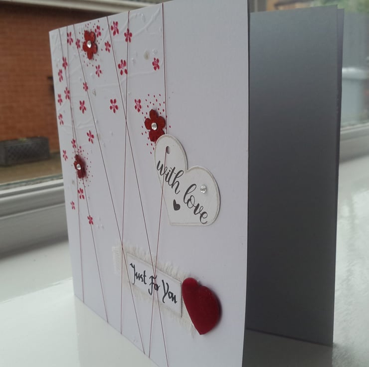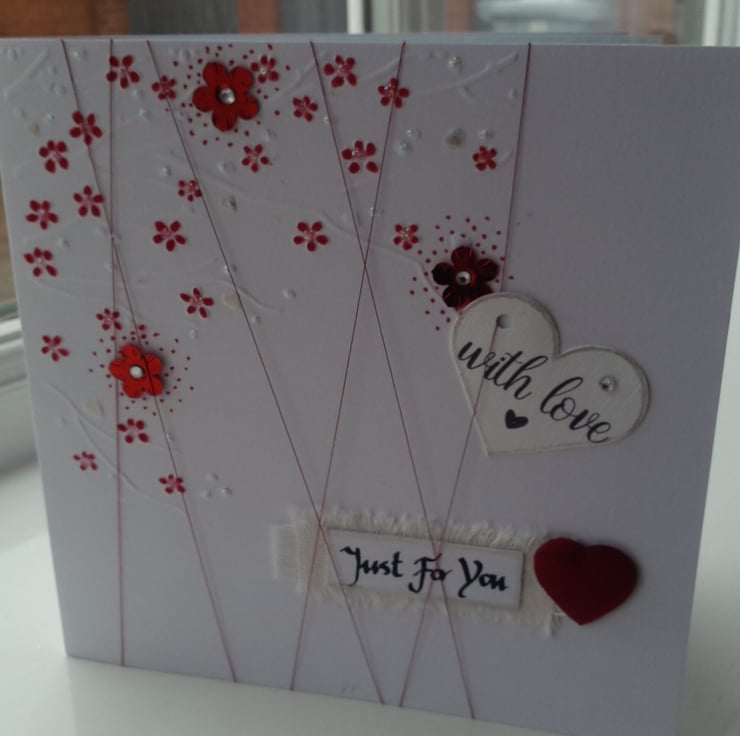 A completely handmade and uniquely designed card. Consisting of quality pristine white card which has been embossed with a pretty blossom branch. The branches have been embellished with red flower sequins, silver rhinestones and red ink. The card has been wrapped with red finished e thread with a with love heart tag. Just for you tag mounted onto white frayed linen. Finished off with a red fabric heart