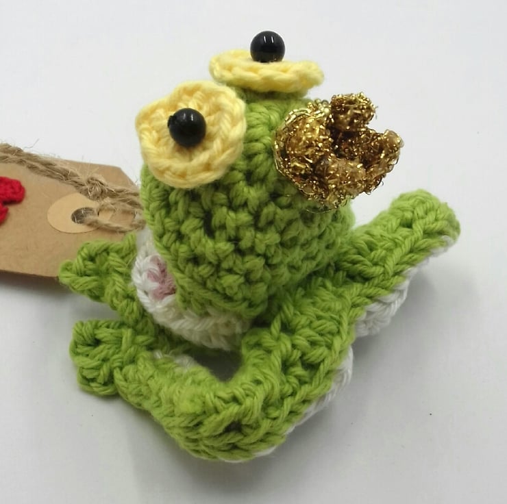 This handsome fellow would make a lovely keepsake alternative to a traditional Valentine's card. It is crocheted in cotton and the top of his head and his thighs are filled with polyester stuffing. He has black beads for eyes,and a crown made of stiffened gold braid. He is carrying a tag which reads 'Kiss me!' on one side and is blank on the other for your own message. He stands approximately 5 cm tall and comes in a labelled PIP ( Postage in Proportion ) box all ready to be given or posted on. He is designed to be posted at the large letter rate rather than as a parcel but will need a little plumping up on arrival!