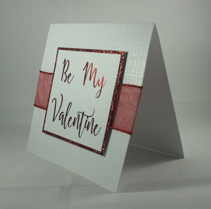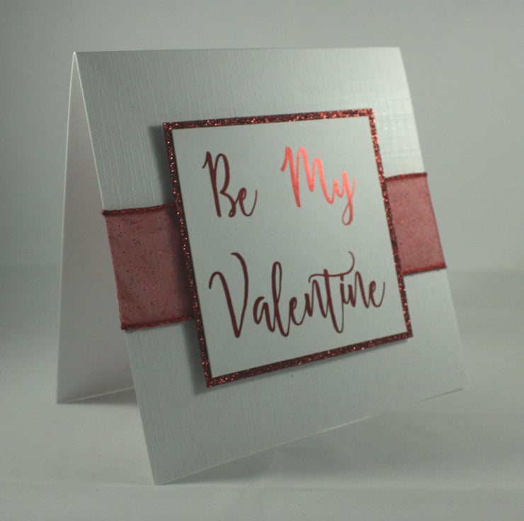 Square Valentine's Day card with a printed and foiled message reading 'Be My Valentine'. This has been mounted onto red glitter card and overlaid on red, glittered, organza ribbon.