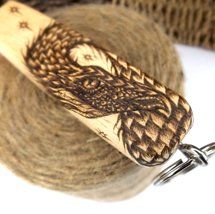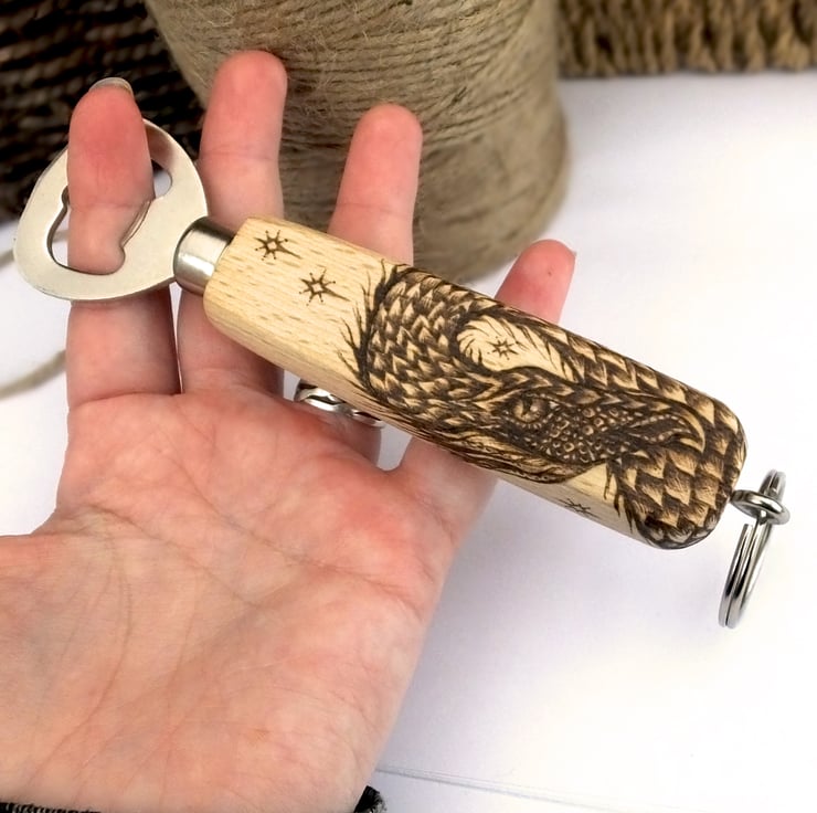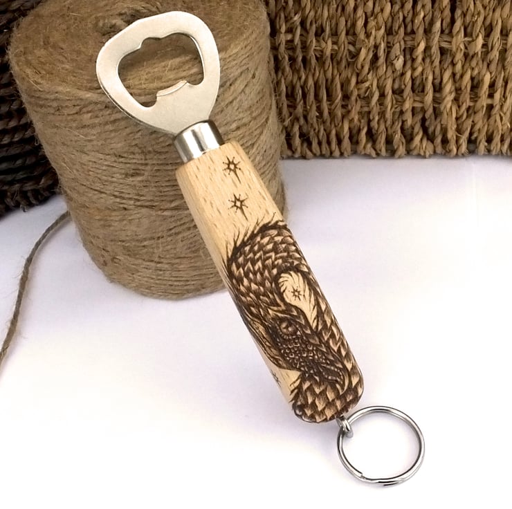 A truly unique dragon, burned into the handle of the wood bottle opener using the art of pyrography. An ideal gift for him or her, and would be ideal to commemorate a 5 year wood anniversary. Blank reverse, can be personalised with a name or date.