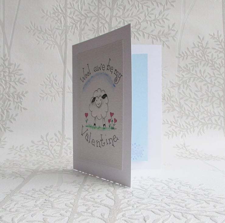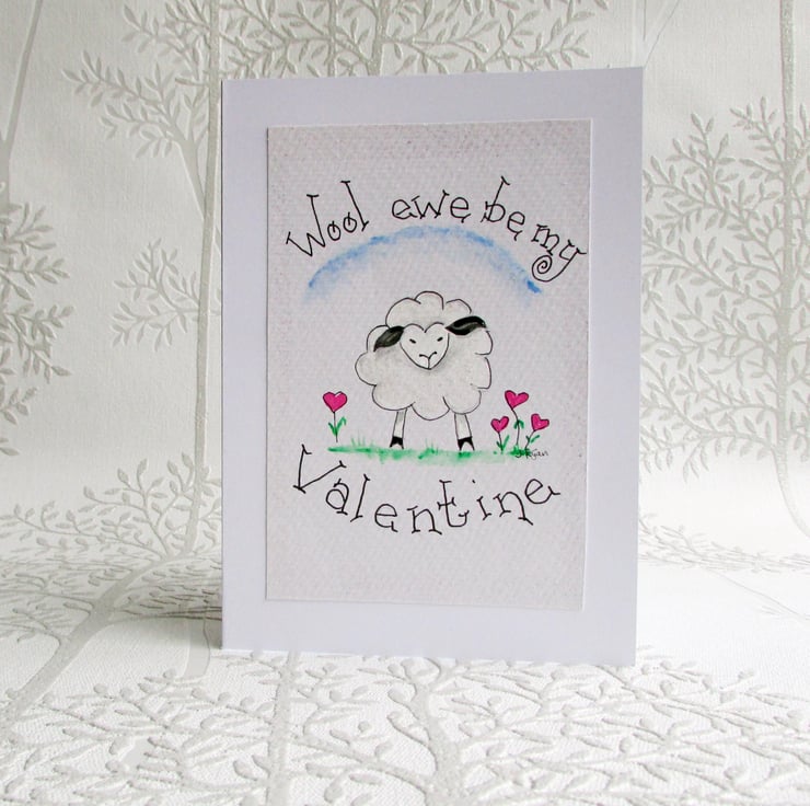 Happy Valentine Card handpainted with a cute little sheep with a smidgen of sparkle. The writing on the front says Wool ewe be my Valentine, a pun on words, a perfect card for anyone who works with wool or keeps sheep.
