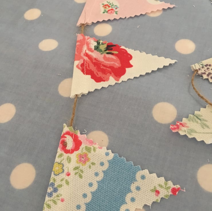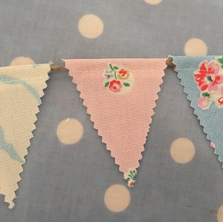 4 ft teeny tiny bunting , each flag is 3” tall, single sided and threaded with twine